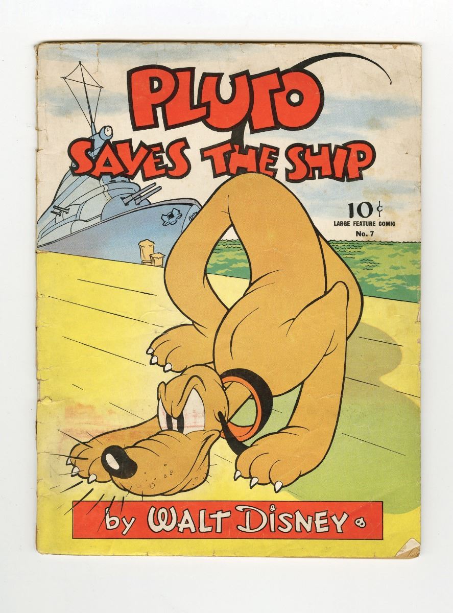 (Dell publishing, 1942) Features an excellent wartime story of Pluto and is notable as Carl Barks' first comic book. Measures 11.25"x8.5". 50 pages. In fair condition with wear and discoloration throughout.