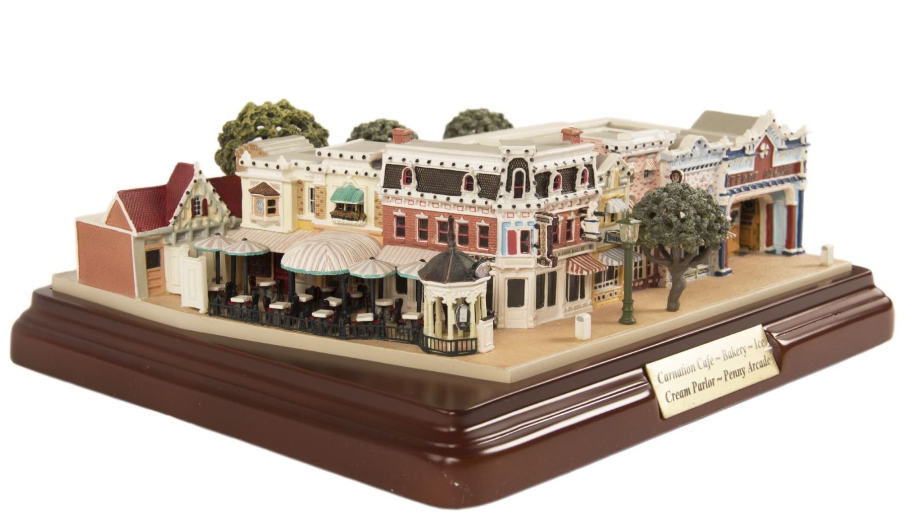 (Disneyland, 2005) A beautiful scale model of Disneyland's Carnation Cafe, Bakery, Ice Cream Parlor, and Penny Arcade. This model was created by renowned miniaturist Robert Olszewski for his very popular Main Street U.S.A. collection of models. This model has lighted elements that are powered by a battery compartment in the base, and is a first edition. The model comes in its original 50th Commemorative Collection box, and includes the power cord and its original certificate of authenticity. Measuring 7"x8" and 3" tall, the model is in very good condition with minor wear from previous display.
