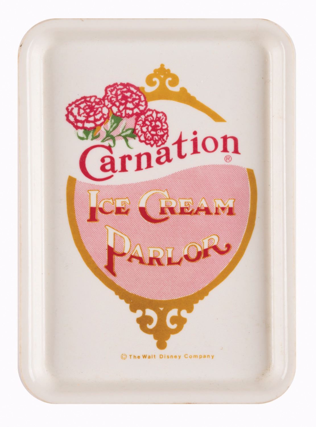 (Disneyland, 1980s) A guest check tray from the popular Carnation Ice Cream Parlor on Main Street. Decorated with the restaurant logo, the tray measures 5"x7" and is in very good condition with expected wear from use.