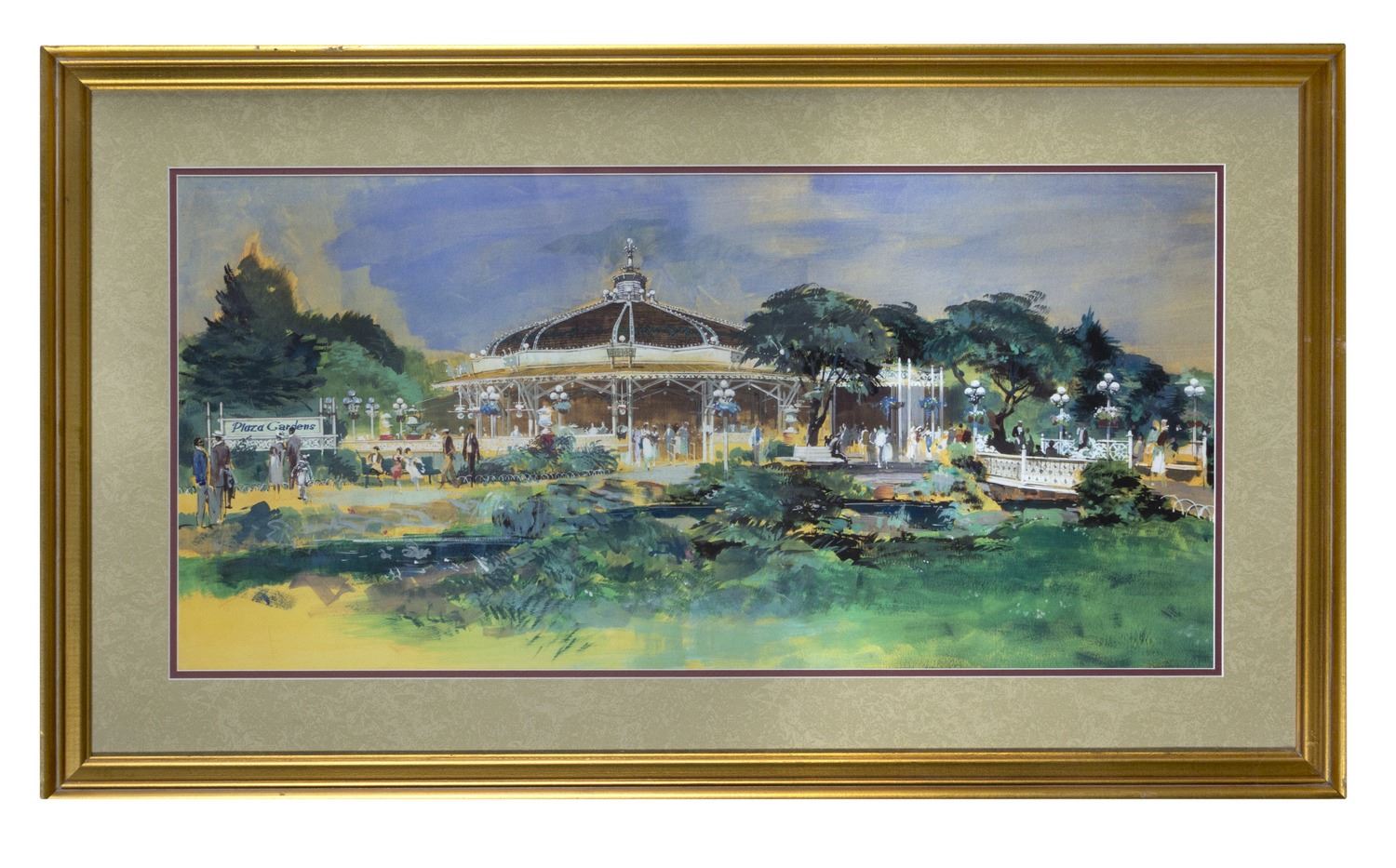 (Disneyland, c.2000s) A beautiful concept art print featuring imagery from the "Carnation Plaza Gardens" at Disneyland. This high-quality print was displayed at the Disneyland Hotel for several years as a way of exhibiting some of the original design work that helped shape the park into what we know it as today. The artwork has an image size of 16"x33" within its 24"x42" gold-tone original frame. The artwork has not been examined out of its original frame, but appears to be in very good condition. The frame itself has some scuffing around the border from its previous display at the Disneyland Hotel.