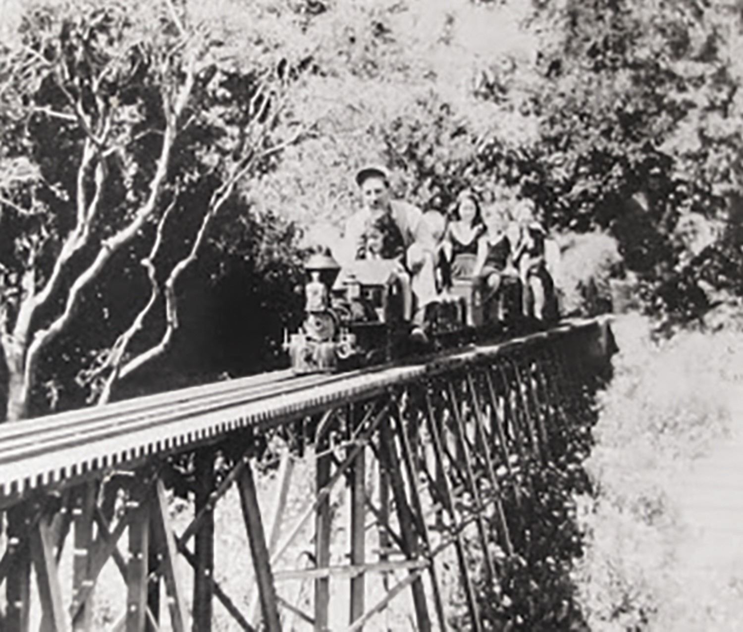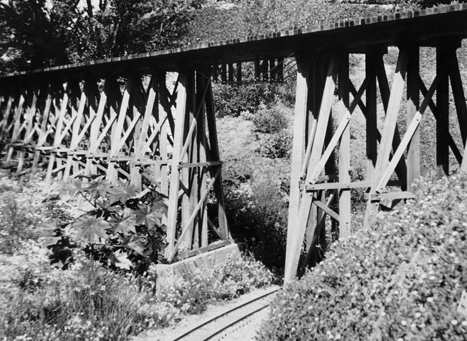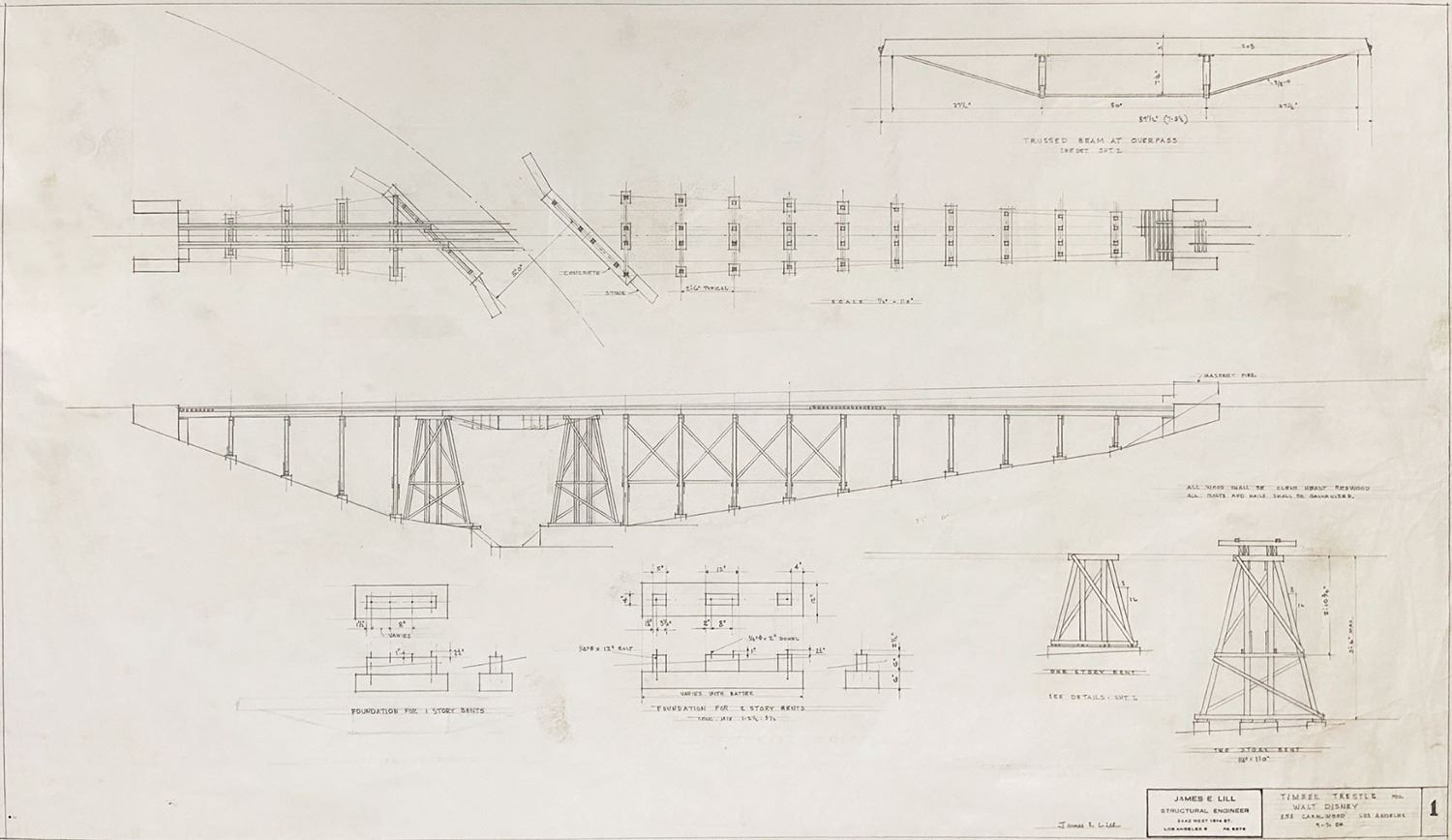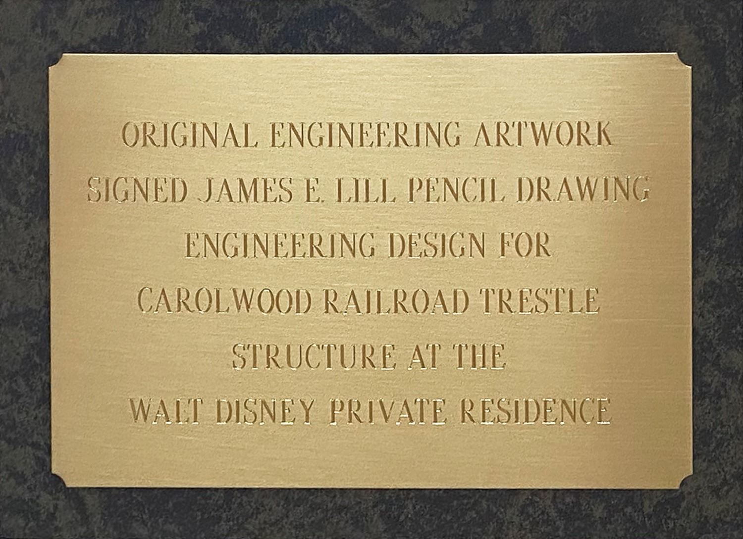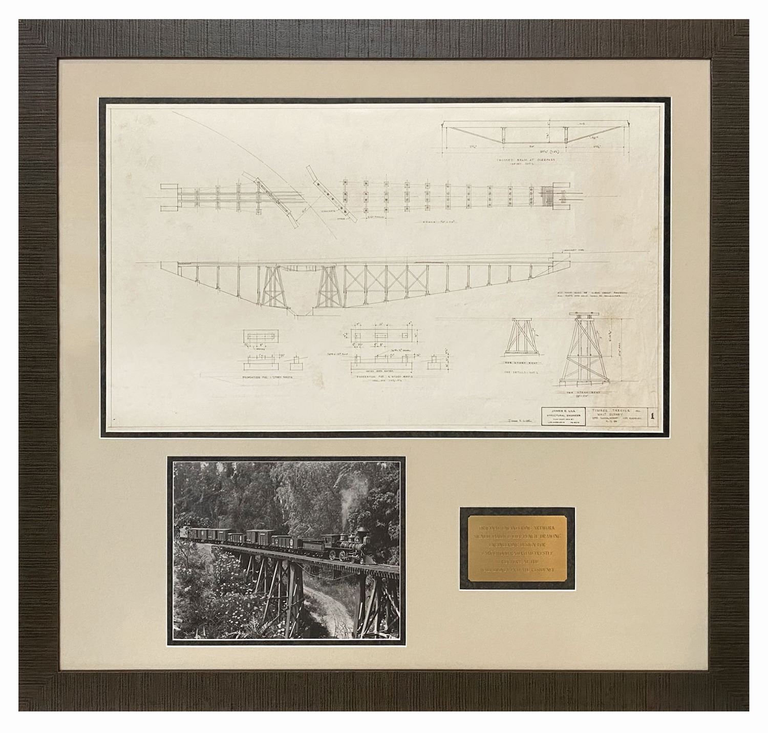 (Disney, 1950) This is the original hand-drawn artwork for the trestle bridge at Walt Disney's backyard Carolwood Pacific Railroad. One of the popular key features of Walt's railroad was the stunning trestle bridge depicted in this original artwork. Designed by engineer James E. Lill, and identified as "Timber Trestle," the artwork depicts the full bridge, complete with notes that "all wood shall be clear heart redwood" and "all bolts and nails shall be galvanized," among others. The drawing is accomplished in pencil on this art paper, and is signed by Lill. The project information in the bottom right identifies the work was for Walt Disney and is dated 9-7-50, although an earlier erased date of 8-28-50 can still be seen. Measuring 19.5"x33.5" within the mat opening of the 42"x44.25" frame, the artwork is in very good condition with handling creases and minor discoloration consistent with its use and age. Original artwork from such an important feature of Walt Disney's life is near-impossible to find, with this particular artwork beautifully representing a key aspect of Walt's beloved Carolwood Pacific Railroad. This item may require special shipping arrangements, please inquire for details and estimates.