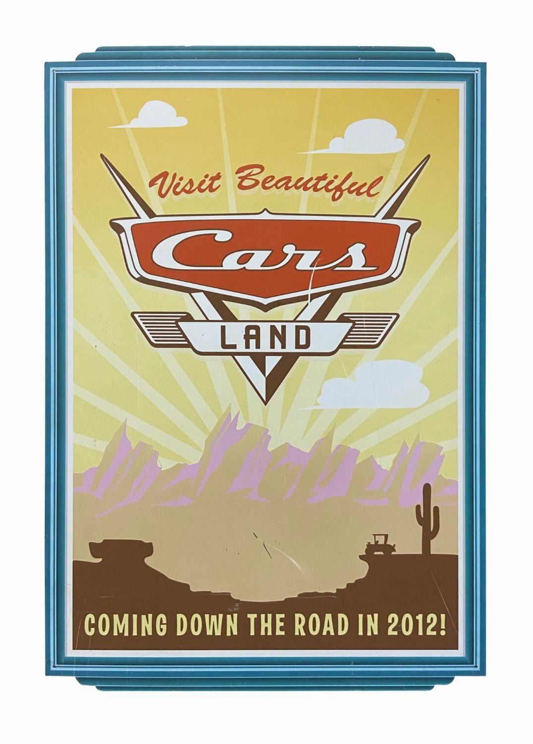 (California Adventure, c.2011) A construction wall sign promoting the opening of Cars Land at California Adventure. The large sign prominently features the land's logo with the slogan, "Visit Beautiful Cars Land." There is some simple imagery below which evokes the bluffs and other landscape scene in Cars Land, and the sign promises the area is "Coming Down the Road in 2012!" Signs such as this one are used in order to beautify construction walls, and also offer a taste of what's to come for guests. Measuring 59"x38.5", the sign is in good condition with some scuffing and scratching to the surface throughout and some edge-wear consistent with park use.