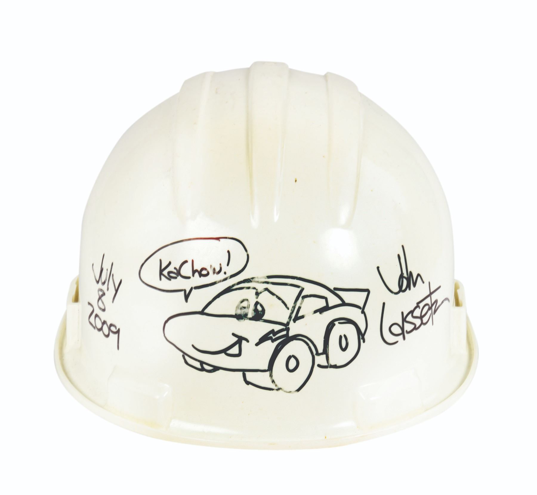 (California Adventure, 2009) A white construction hard hat worn by a VIP at the ground breaking ceremonies for Cars Land on July 8, 2009. This hard hat was signed by John Lasseter following the event, along with a drawing of Lightning McQueen. The hard hat is in very good condition with some surface wear from use, and some minor wear to the drawing.