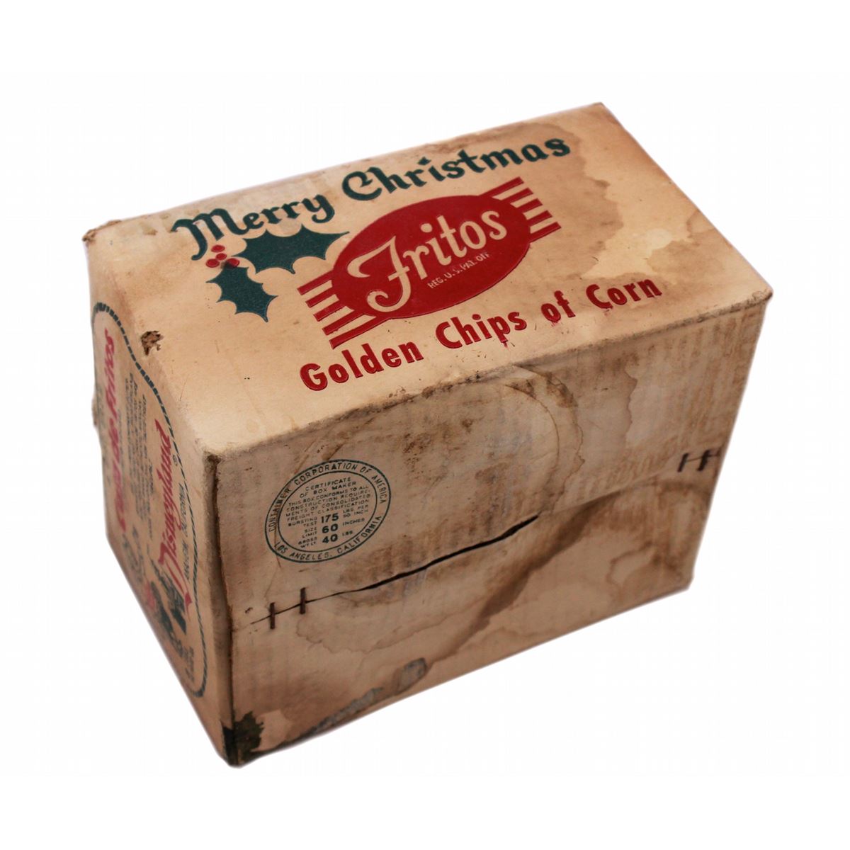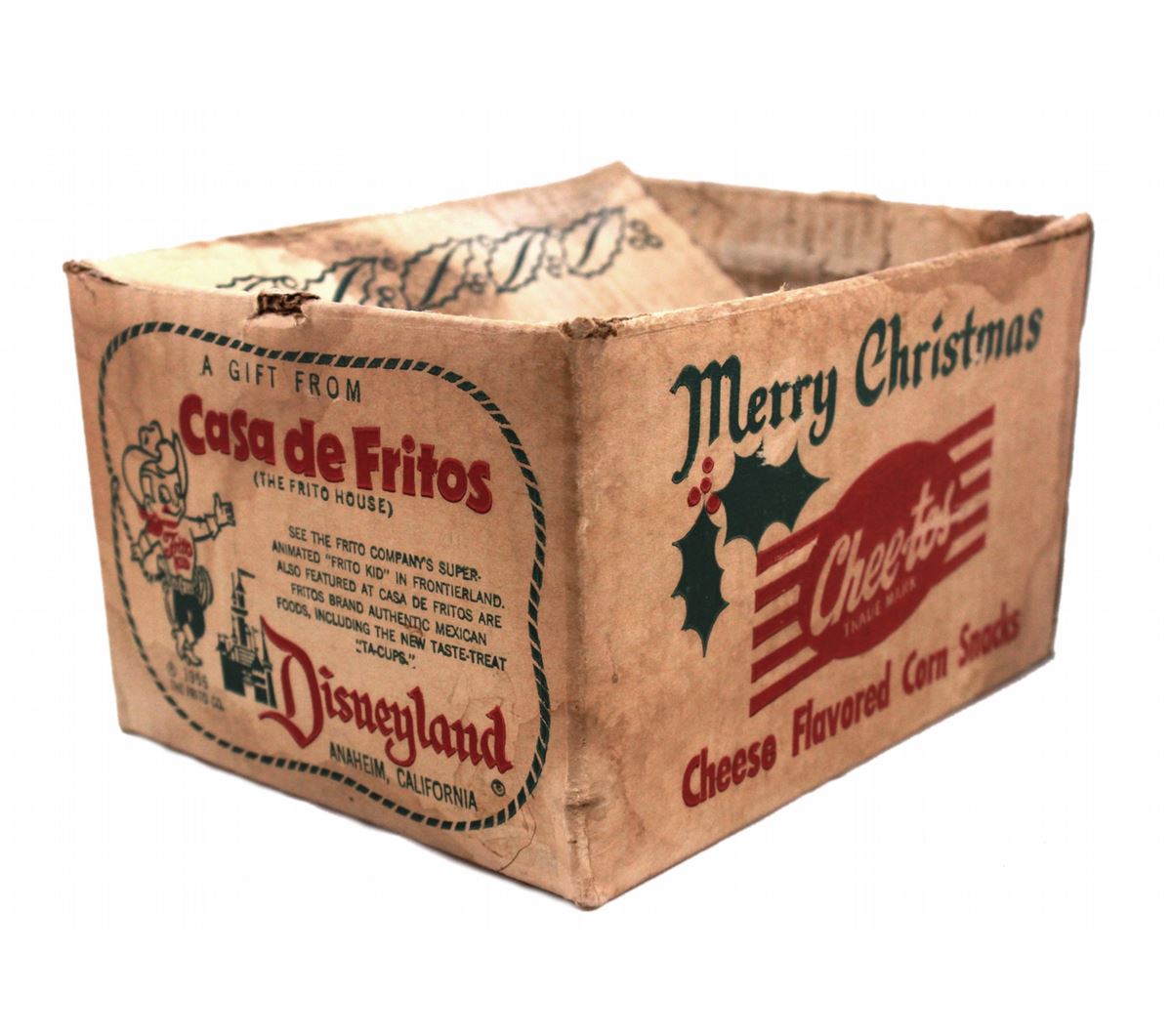 (Disneyland, 1955) Nothing says “Merry Christmas” more than a bag of “Fritos” or “Cheetos” mailed direct from Disneyland’s Casa De Fritos restaurant. This extremely rare mailing box allowed guests to order and mail home Frito’s golden chips as Christmas gifts in the winter of 1955. This 7 x 9 x 5 in. box shows plenty of wear and water staining, but all the graphics still show nicely, and finding another example is likely close to impossible.
