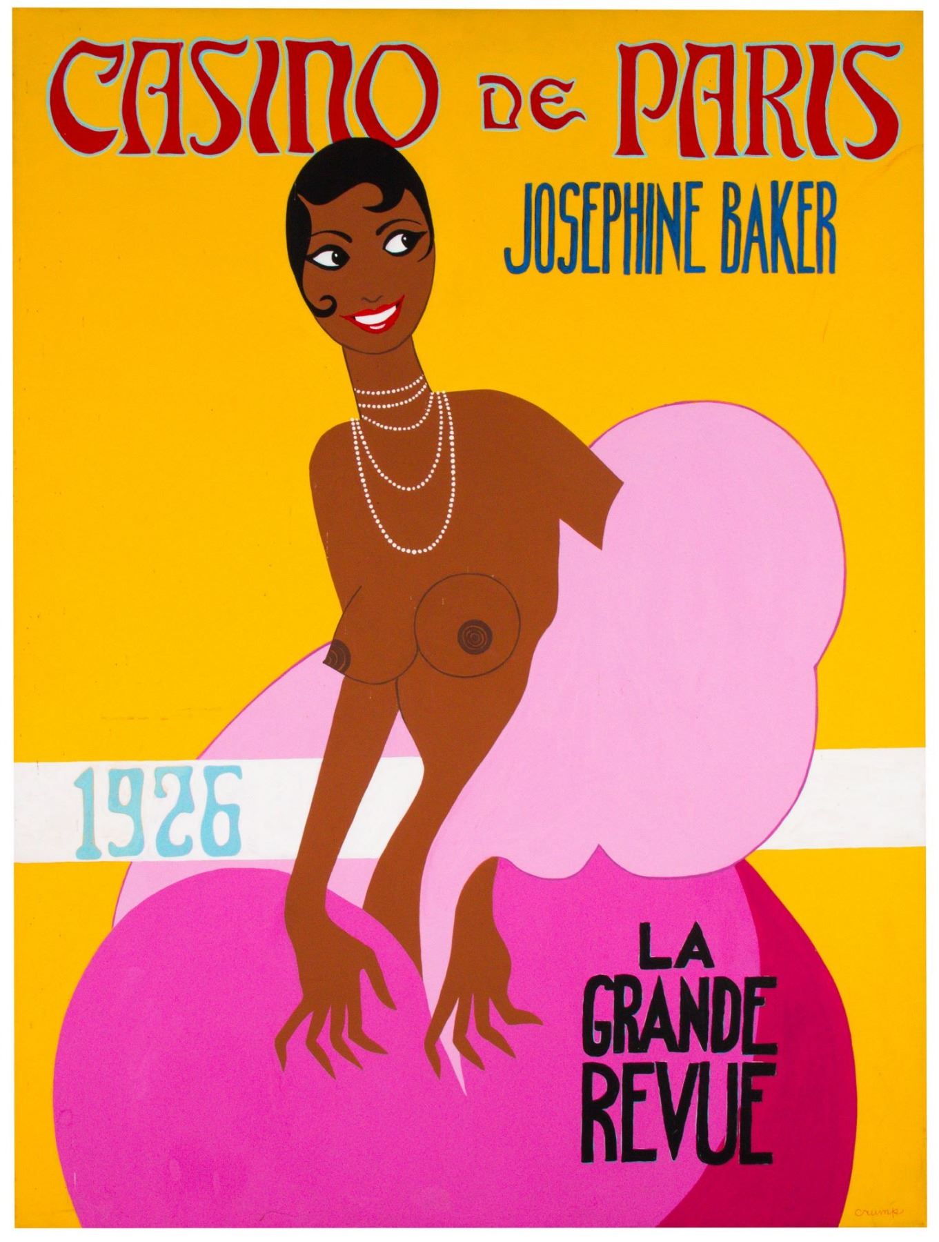 (2001) An original painting by Rolly Crump of French singer and entertainer Josephine Baker. Titled "Casino de Paris", this painting is accomplished in acrylic on canvas and measures 40"x30". The condition is good with some surface wear, and Crump has signed the lower-right corner.