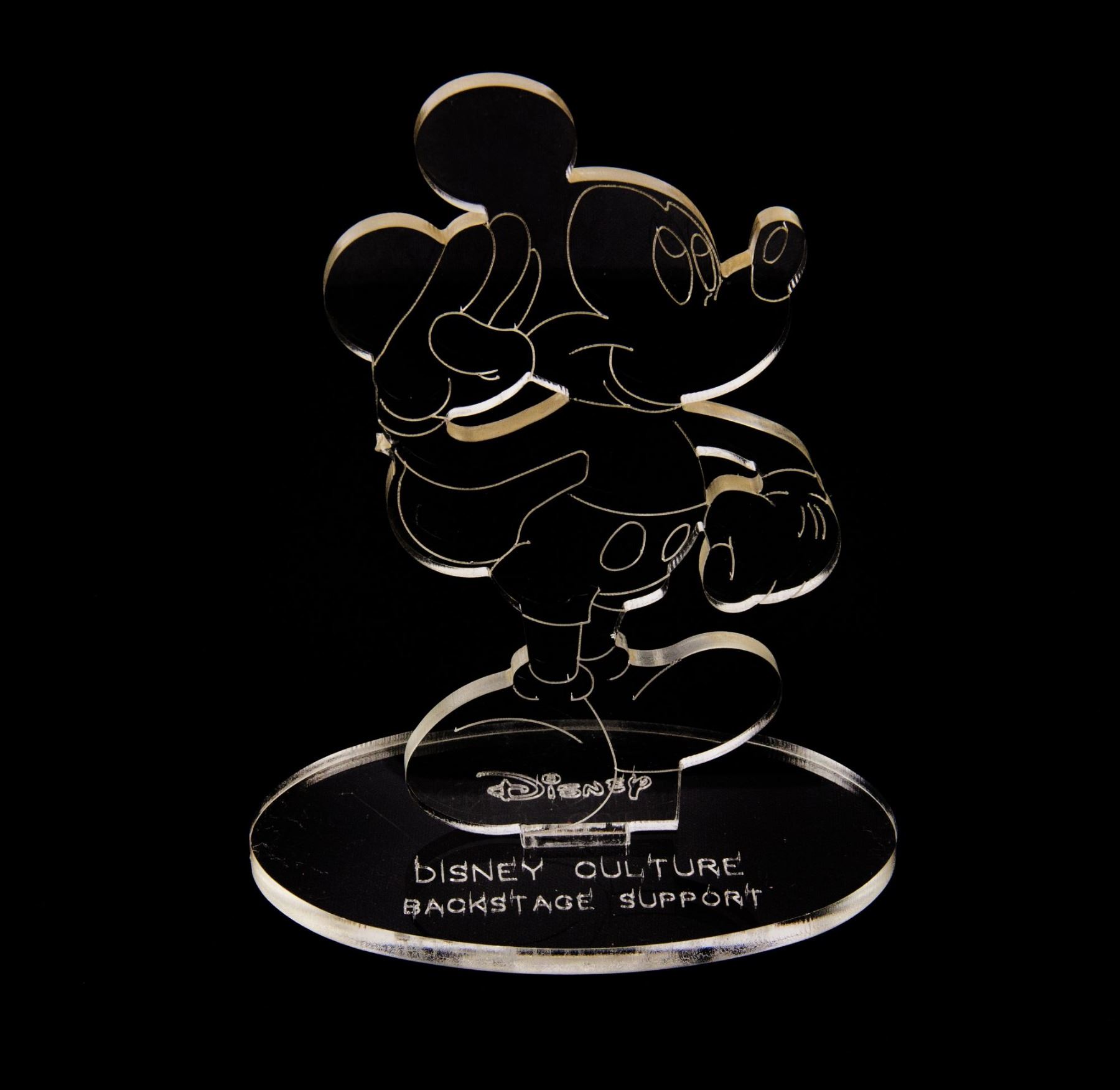(Disneyland, c.1990s) A lucite "Disney Culture" award for Backstage Support. The award is styled after a saluting Mickey Mouse which can be removed from the base. Measuring 6" tall, the award is in good condition with some minor wear from previous display.