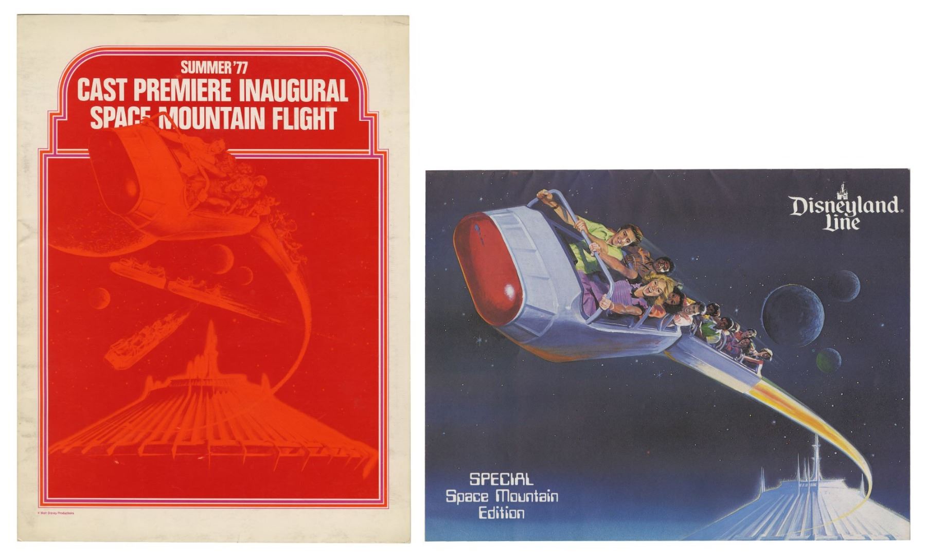 (Disneyland, 1977) A rare packet given to the cast members who attended the Inaugural Flight for Disneyland's Space Mountain in the Summer of 1977. The outer folder contains an issue of Disneyland Line magazine that discusses the opening of the attraction with great photos of concept art as well as intriguing facts and figures. Measuring 12"x9", the packet is in good condition with some wear and spots of discoloration to the outer folder from use.
