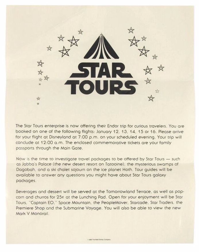 (Disneyland, 1987) A pair of (2) unused boarding passes in red with white text, from the cast premiere of the "Star Tours" attraction between January 12-16, 1987. The premiere occurred between 7pm and midnight on those dates, with this pair of tickets for "flight no. 1120" on Jan 15. These tickets come in their original ticket envelope with "Star Tours" imagery on the front, and also include the extremely rare invitation letter discussing the event. The tickets measure 3.25"x8.25" each, and the set is in very good condition with minor creasing to the letter and envelope.