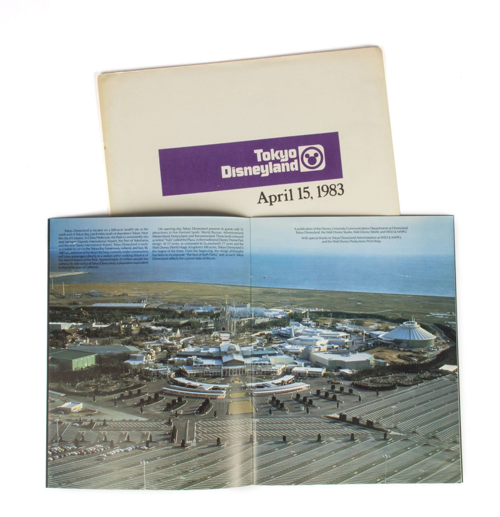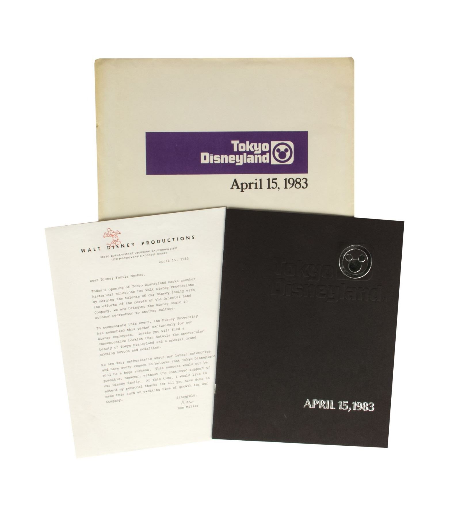 (Tokyo Disneyland, 1983) A rare cast member packet given to Disneyland employees on April 15, 1983, to commemorate the grand opening of Tokyo Disneyland. The packet includes a Tokyo Disneyland folder, a letter from Ron Miller addressed "Dear Disney Family Member", and a commemorative booklet that highlights aspects of the newest Disney park through color photos and informative descriptions. Measuring 9"x12", the packet is in very good condition overall with minor wear.