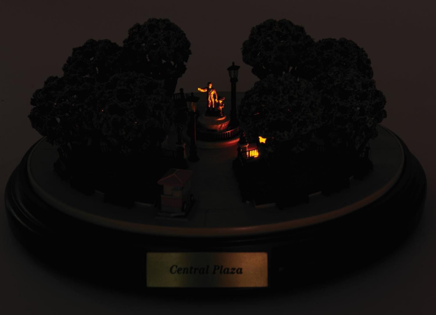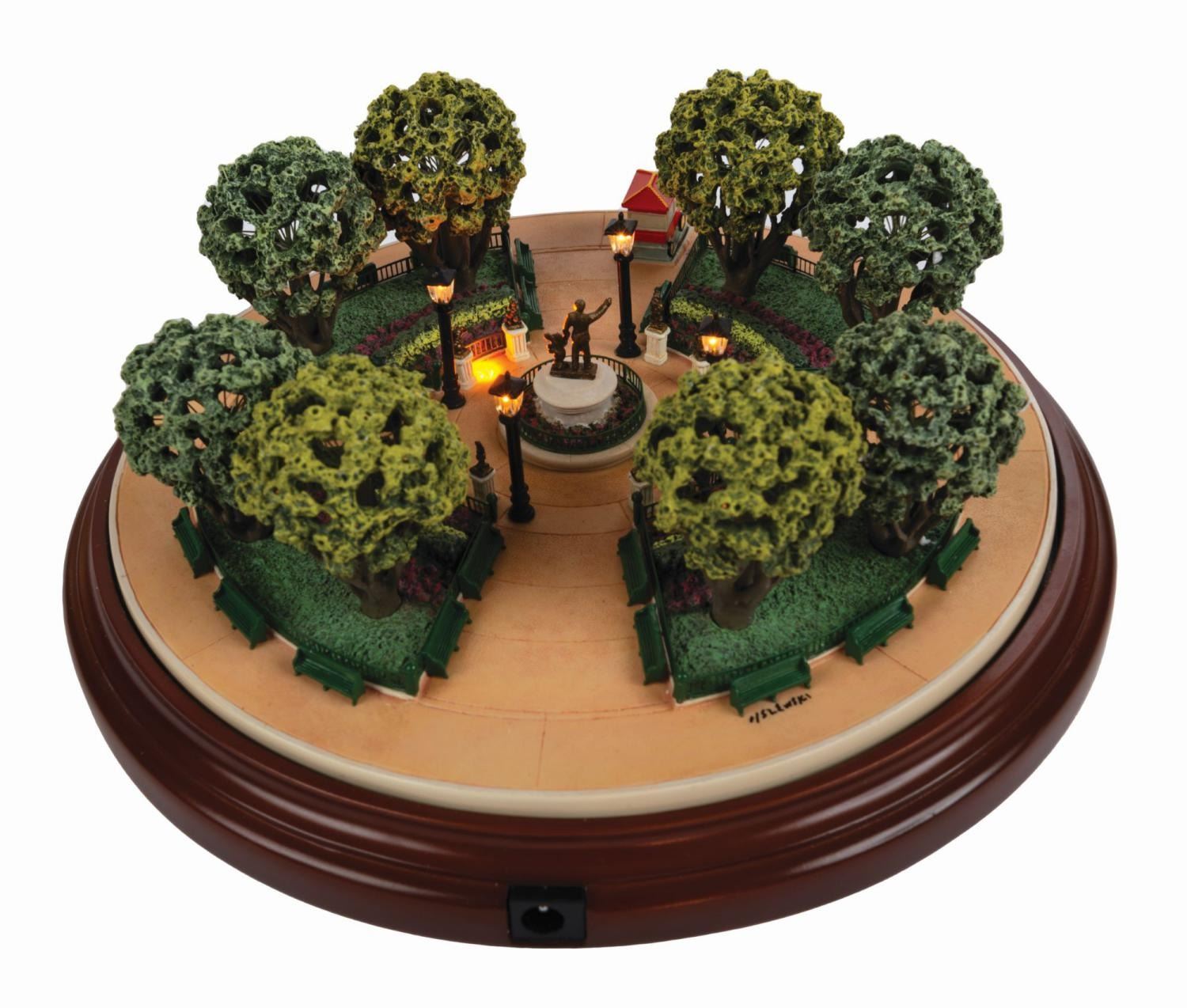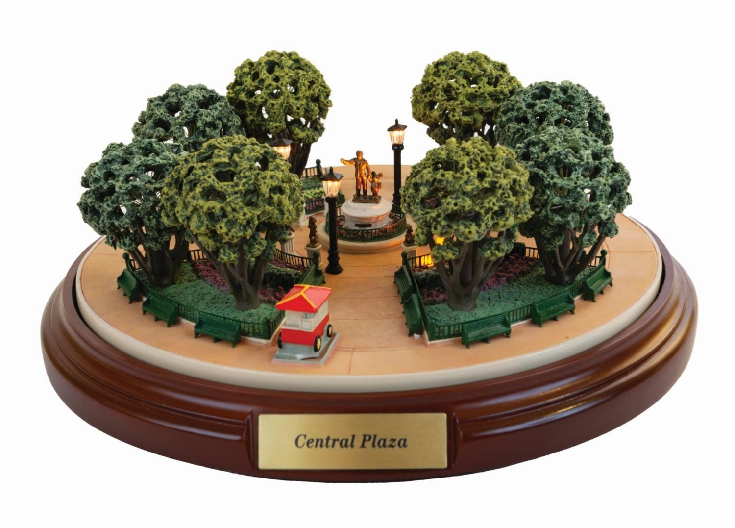 (Disneyland, 2003) A beautifully crafted model of Disneyland's iconic Central Plaza Hub in Main Street, created as a First Edition by renowned miniaturist Robert Olszewski. The magical 1/140th scale model has lighted tree and lamppost elements, that are powered by two separate battery compartments in the base. Measuring 7" in diameter and 3" tall, the model is in very fine condition with minor wear from previous display, retaining its original boxed power pack. Measuring 9.5"x9.5"x5.25" box retaining the original price sticker, has sustained some minor damage. The First Edition Disneyland Main Street USA Collection COA is included.