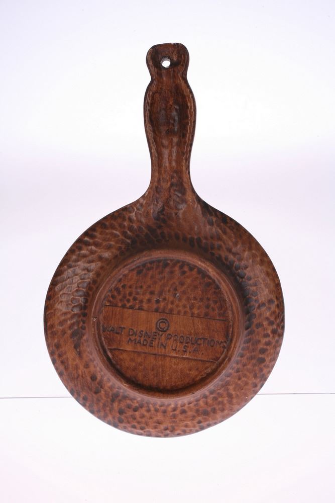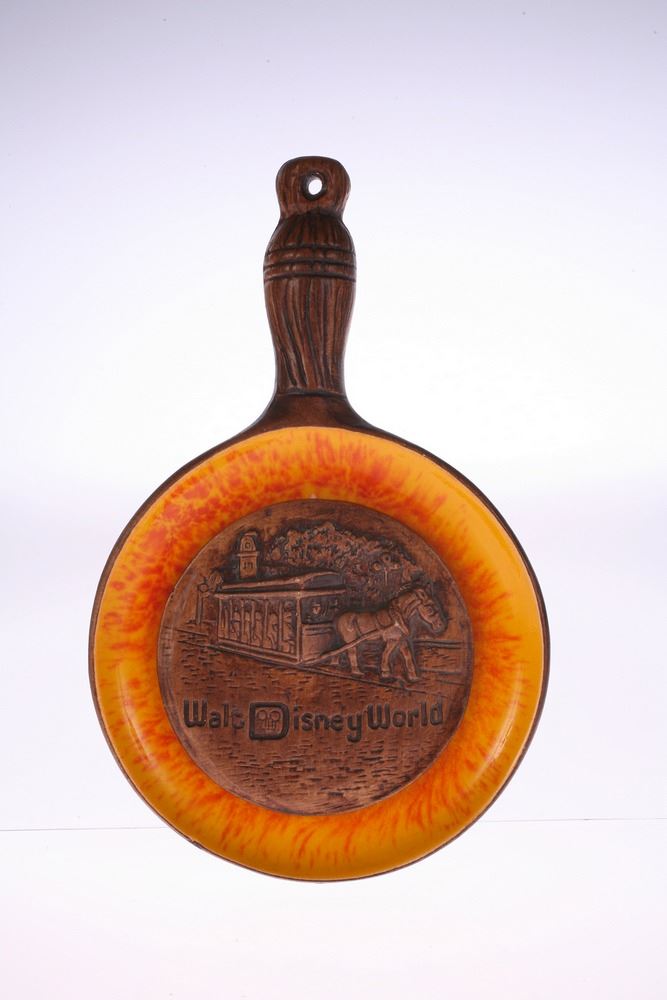 (Walt Disney World, 1970s) Ceramic wall decoration in the shape of a frying pan, featuring a horse and trolley. Created by Treasure Craft Pottery for Walt Disney World. Measures 4.8"x7.75". In good condition with minor wear.