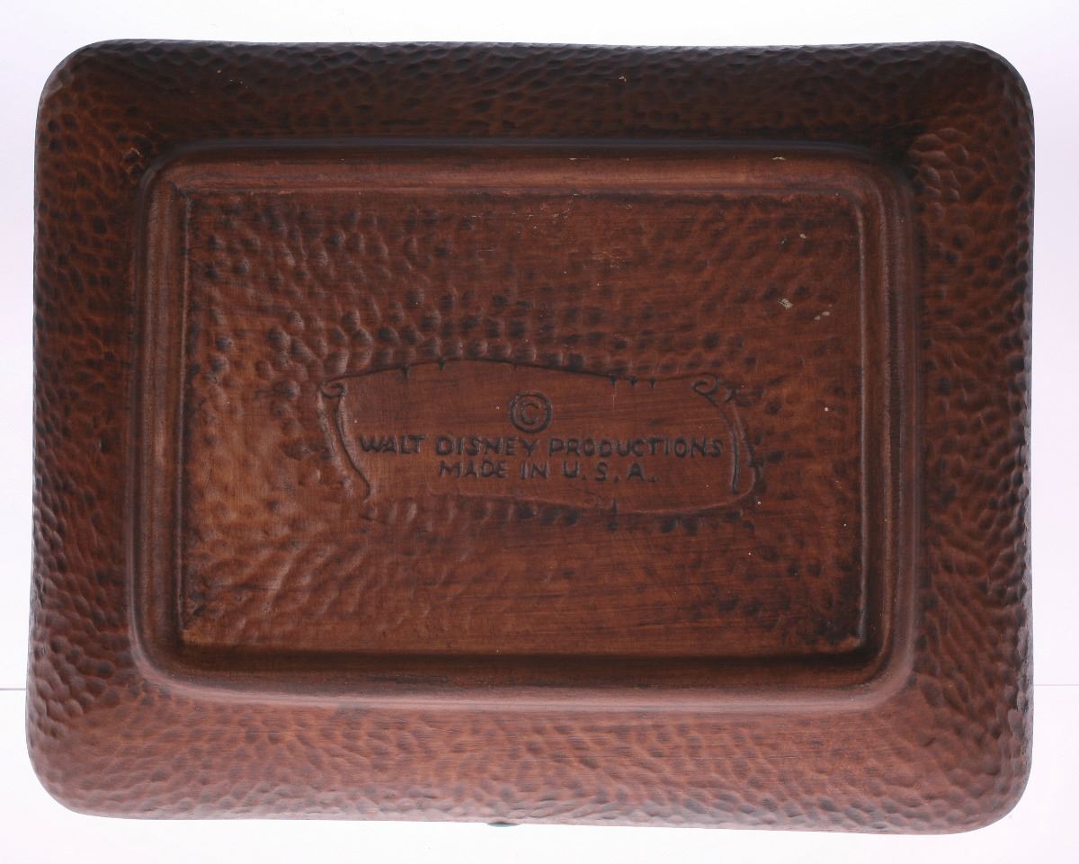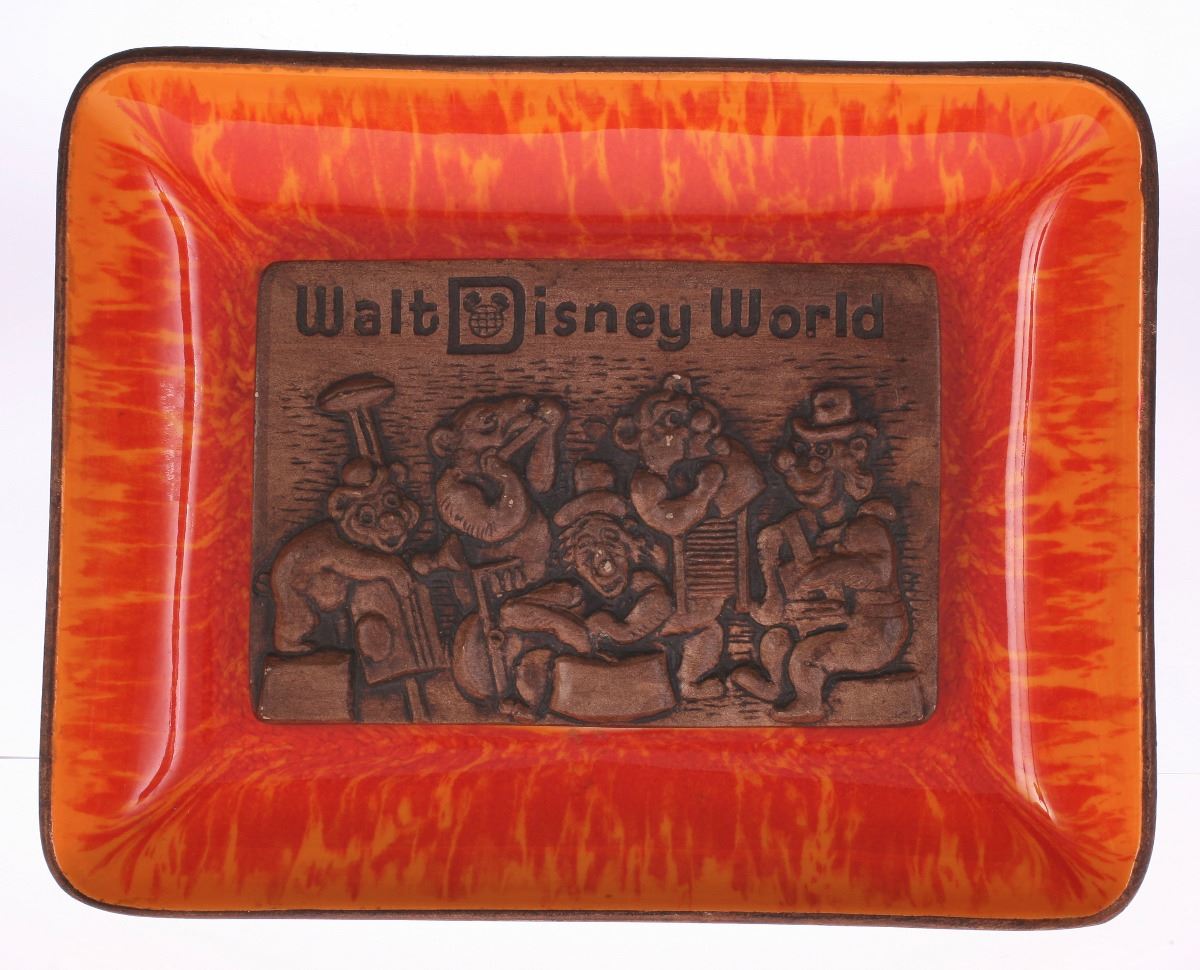 (Walt Disney World, 1970s) Ceramic wood-look brown and orange tray featuring raised imagery of the Country Bear Jamboree in the center. Created by Treasure Craft Pottery. Measures 5.75"x7.25" and 1.4" tall. In good condition.
