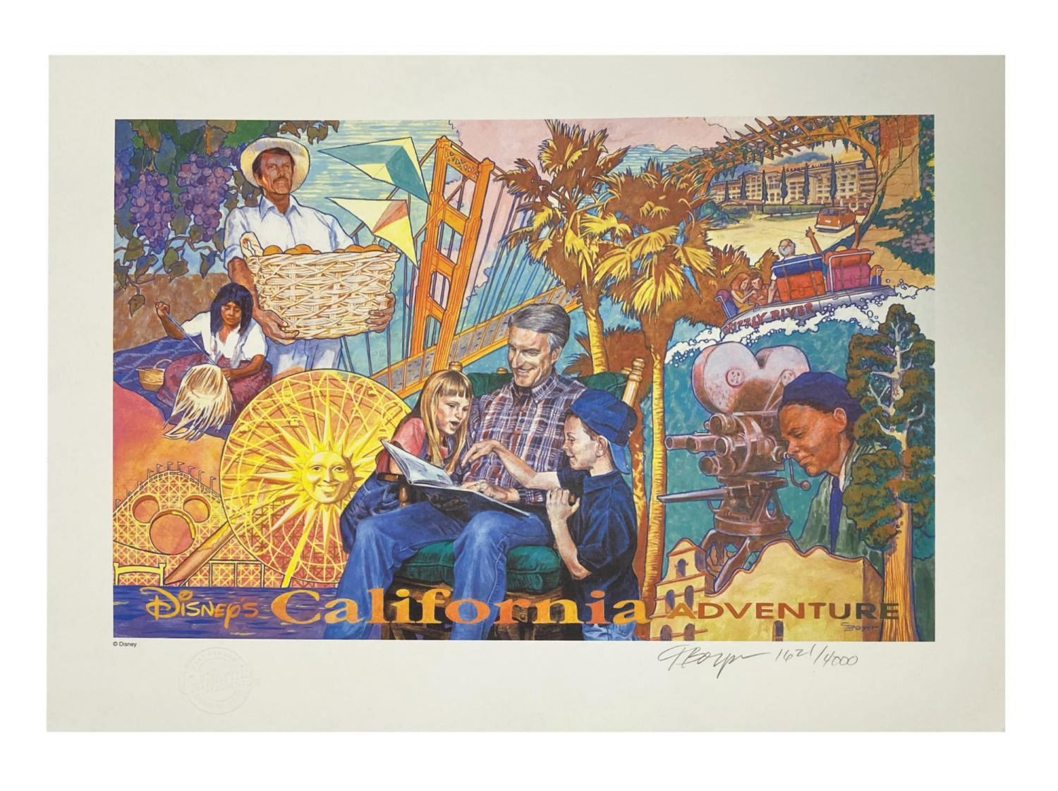 (California Adventure, 2001) A beautiful Cast Member exclusive lithographic print created to commemorate Disney's California Adventure. The print by artist Charles Boyer features imagery representative of both the Park and the state of California, and is hand-numbered 1621/4000 at the lower right beside the artist's signature. There is an embossed California Adventure seal at the lower left. The print measures 14.5"x20" overall with an image size of 11"x17" and is in very good condition with minor edge-wear, including some bending at the corners.