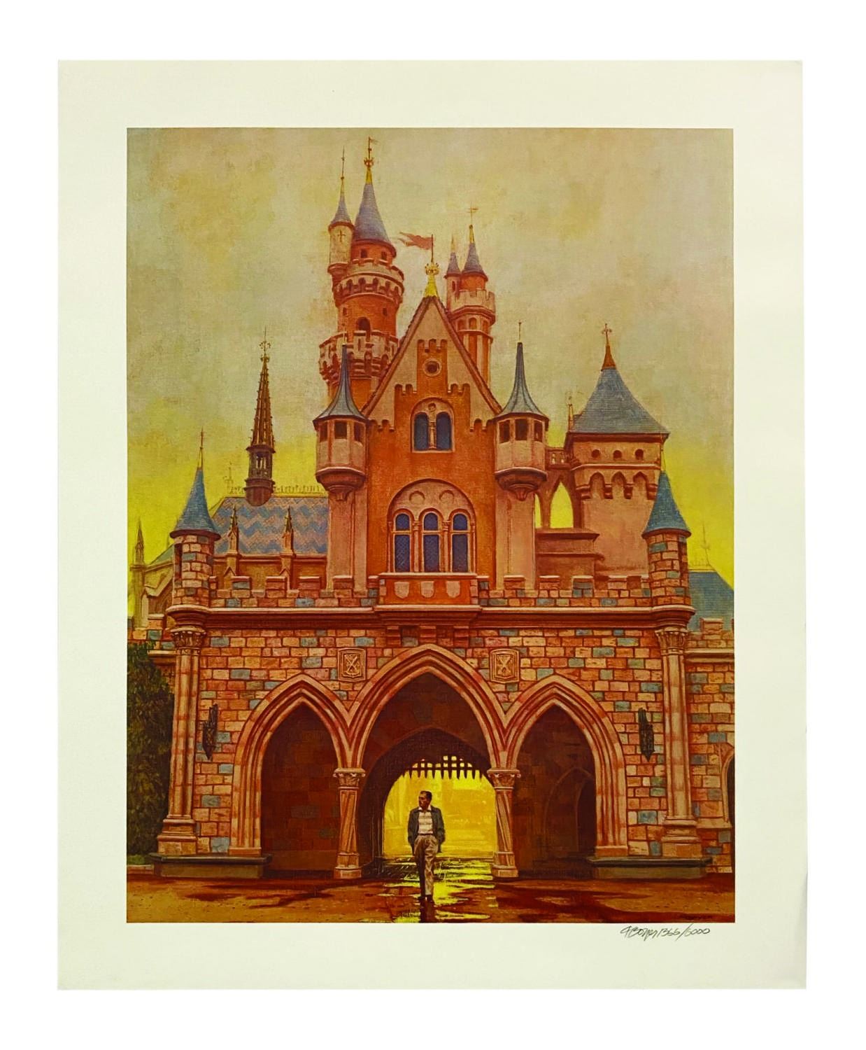 (Disneyland, 1985) A limited edition lithographic print titled "Footsteps" by artist Charles Boyer. Based on a 1964 photograph of Walt walking in front of Sleeping Beauty Castle, the piece was created to commemorate the park's 30th anniversary. The print is signed by the artist in pencil at lower right, "C Boyer," and hand-numbered, "1366/6000." A Disneyland COA is included. Measuring 27.5"x21.5", the piece is in very good condition with a 3.5" bend along the bottom right edge and some corner bumping.