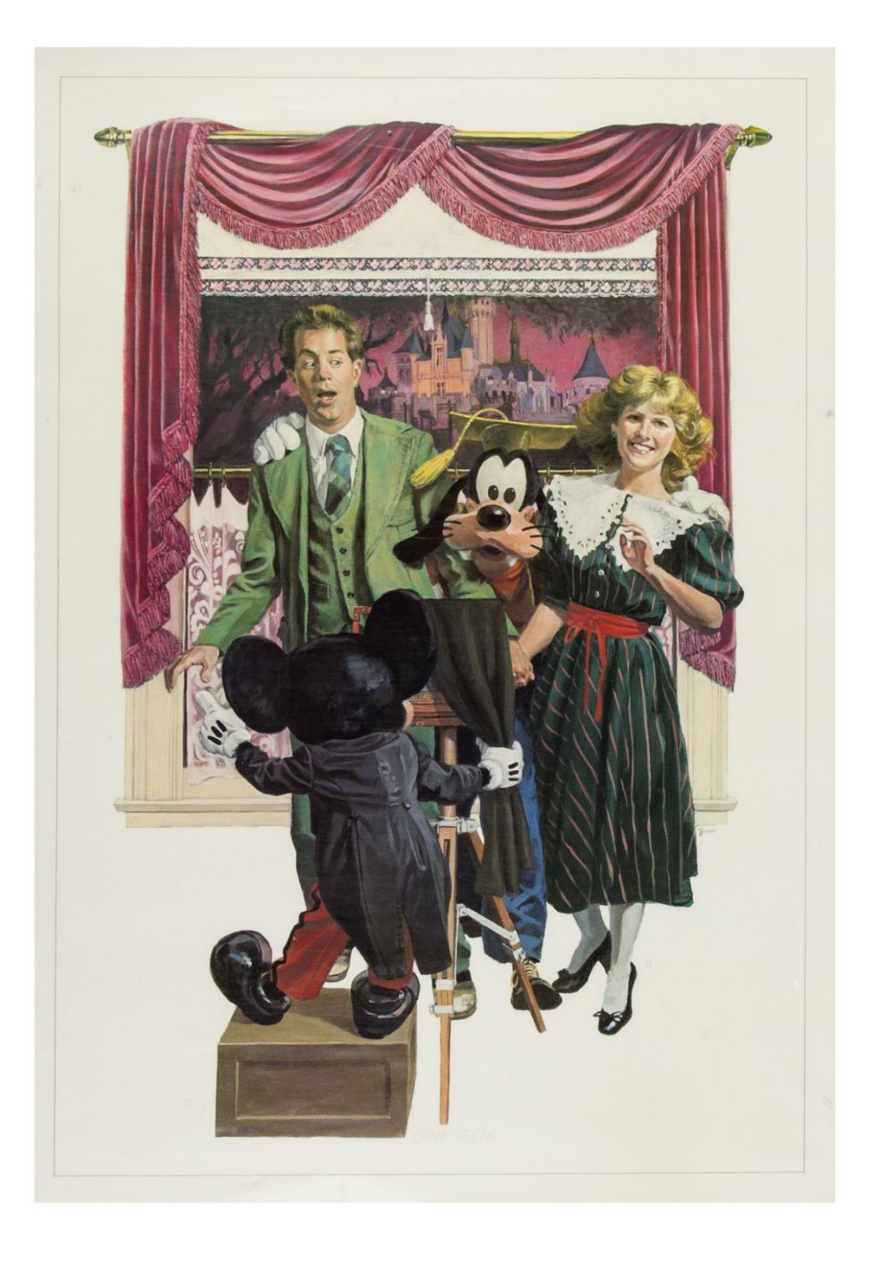 (Disneyland, c.1970s-80s) A beautiful limited edition lithograph created by Charles Boyer that features a couple at a Disneyland "Grad Nite" event. The image depicts Mickey Mouse with two students taking their Grad Nite photo, and the lithograph is signed and numbered by Boyer as 53/1100. Measuring 33.5"x22.5", the print is in very good condition with minor wear.