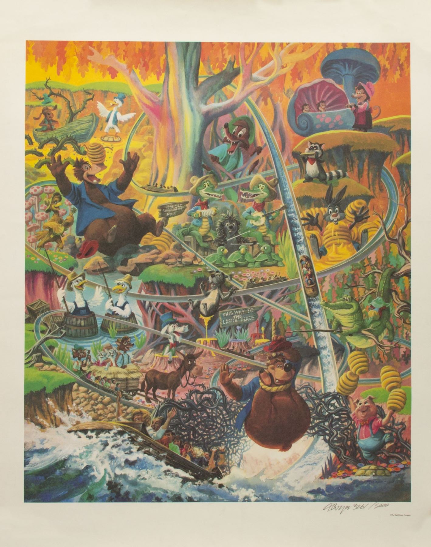 (Disneyland, 1989) A limited edition signed lithograph by Charles Boyer, created to commemorate the opening of "Splash Mountain" at Disneyland. The 30"x24" lithograph is titled "The Laffin' Place" and is signed by Boyer in the bottom-right corner. The lithograph is numbered 3261/5000 and is in good condition with some discoloration and wear to both sides of the paper.