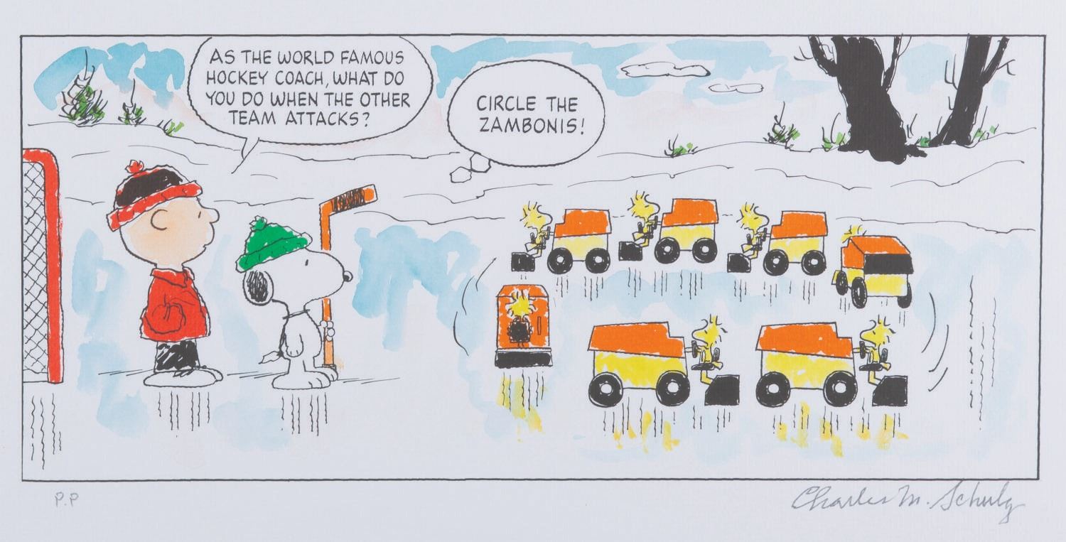 (Charles Schulz, 1995) A Charles Shulz signed Limited Edition lithograph titled"Circle the Zambonis." Released in an edition of 500 pieces, the image features Woodstock (and friends), Snoopy, and Charlie Brown. This Printer's Proof is one of a handful aside from the numbered edition, with Schulz's distinctive signature in pencil. The artwork was created on Italian watercolor paper measuring 23"x16", and is in very fine condition.