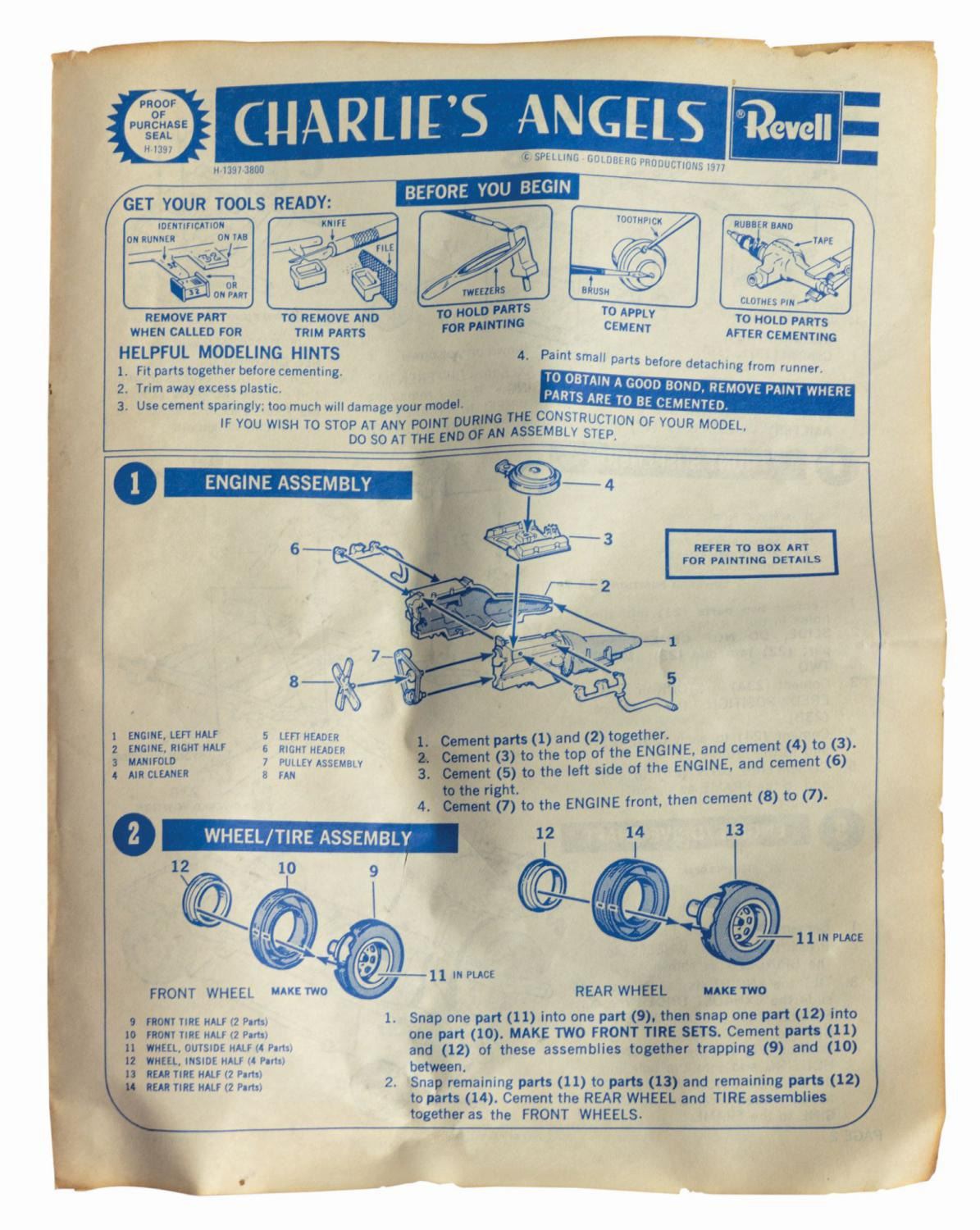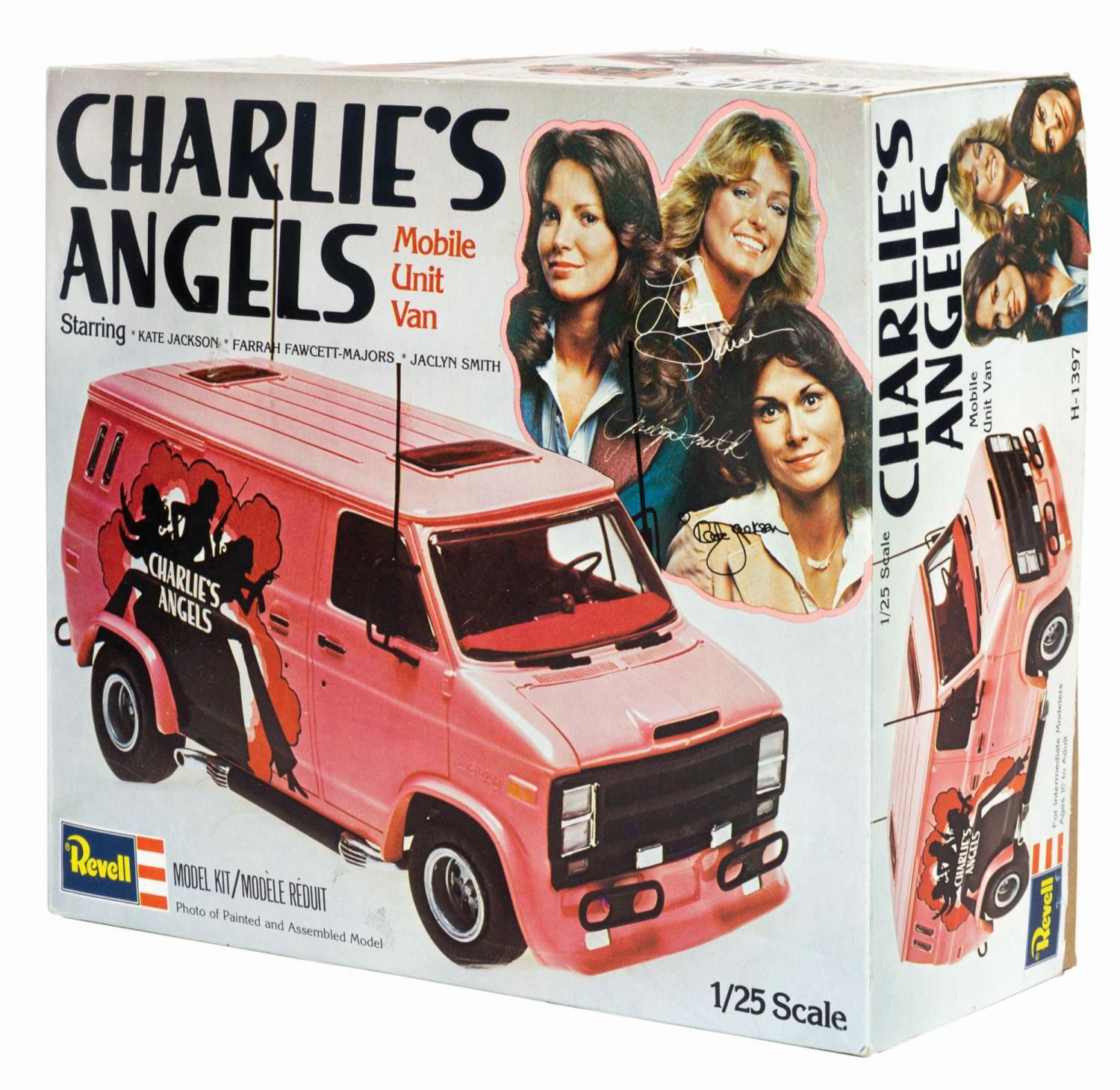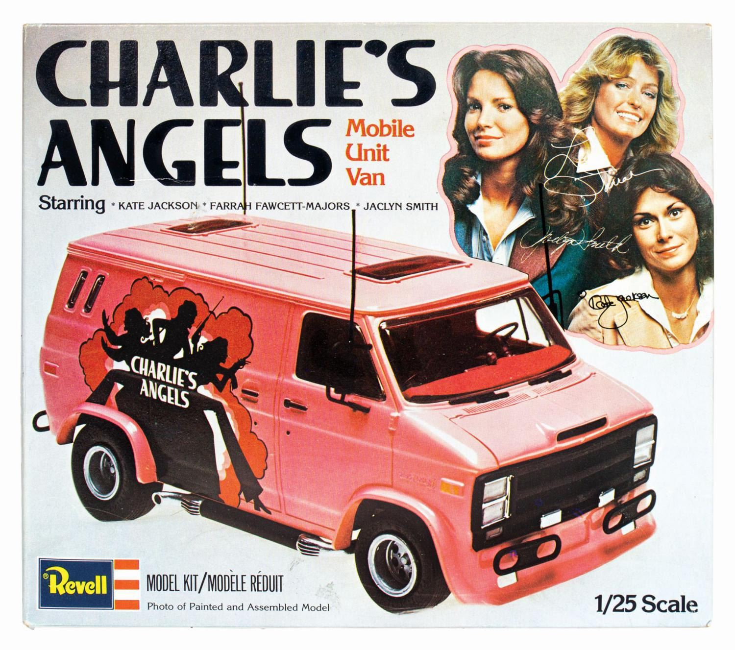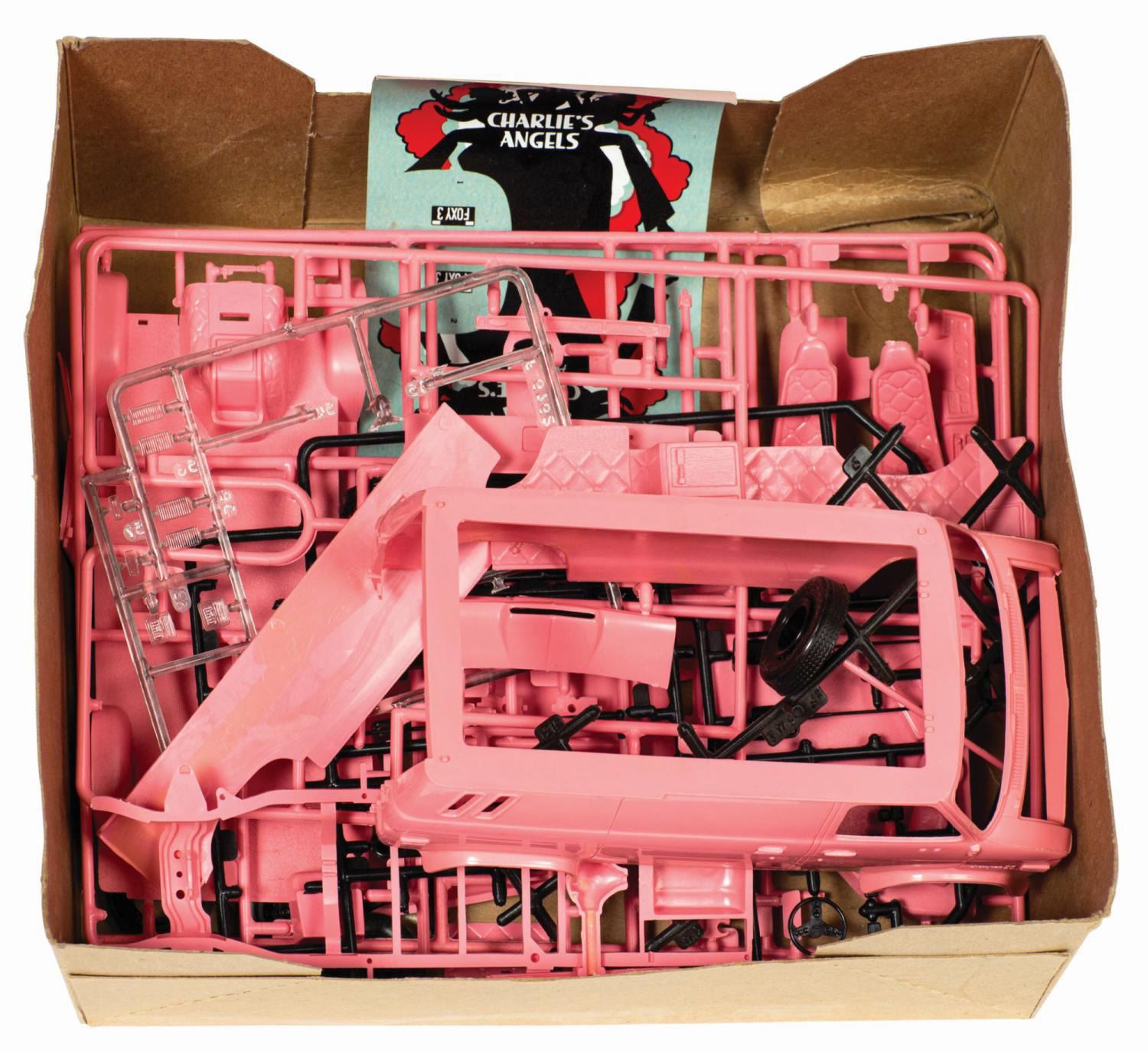 (Revell, 1977) A vintage 1:25 scale Charlie's Angels Mobile Unit Van manufactured by Revell. Constructed of pink, black, and translucent plastics, many model components are still connected to their runners as manufactured. The decal sheet is intact and the instruction manual is included. Measuring 9"x10" and 3.75" deep, the original box is in good condition. The lid exhibits only minor wear, but the bottom of the base is dented. The instruction manual has browned from age. The model pieces themselves are largely as-new.