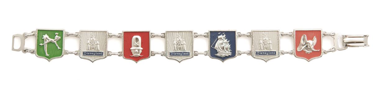 (Disneyland, 1960s) A stylish Disneyland charm bracelet with 7 charms featuring Tinkerbell over a green backing, 3 Silver Castles with blue Disneyland written below them, 1 park security charm, a Columbus boat blue, and a Dumbo charm with pink backing. Comes in its original clam-shell box. Bracelet measures 7.25". In very good condition, box has light wear.