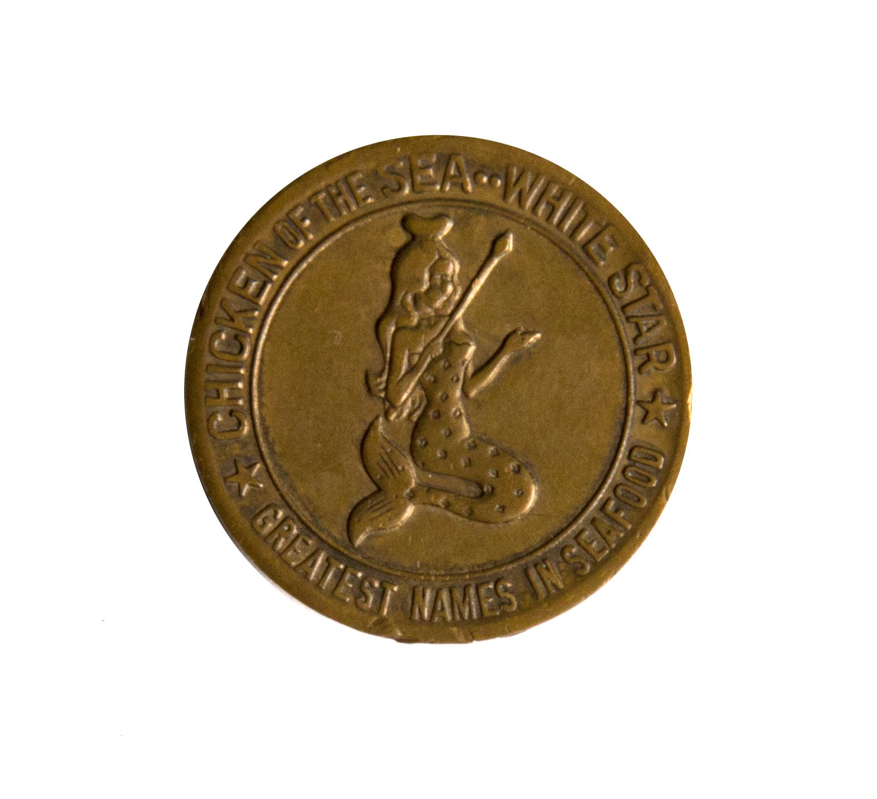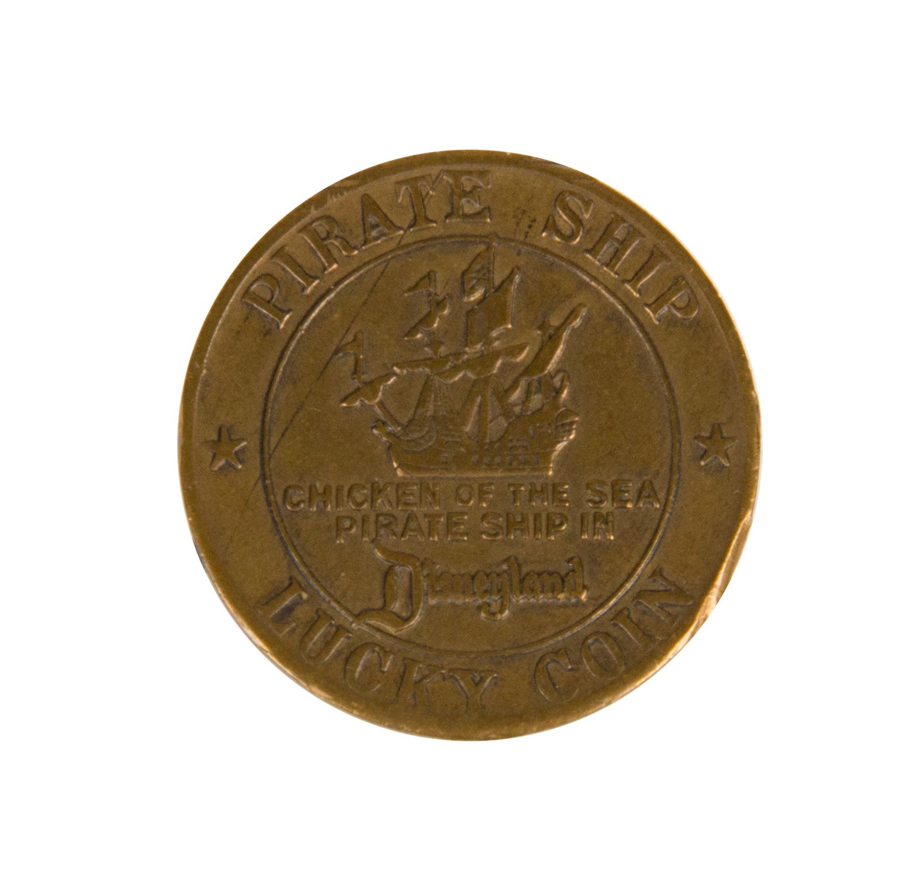 (Disneyland, c.1960) An extremely rare "Lucky Coin" created as a promotional item for Chicken of the Sea's "Pirate Ship Restaurant" in Fantasyland. This coin features the Chicken of the Sea mermaid on one side, and a depiction of the restaurant on the other. The coin measures 1.25" in diameter and is in very good condition with minor wear from use.
