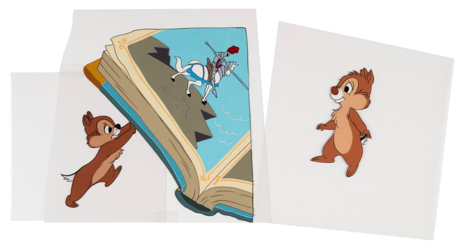 (Disney, 1954) Three original production cels featuring Chip and Dale from the 1954 theatrical short, "Dragon Around." With image sizes ranging from 2” x 3.5” to 5.75” x 6.75” on trimmed cels ranging from 5” x 5.5” to 7.25” x 7.75”, the art pieces are in very good condition with light scratches.