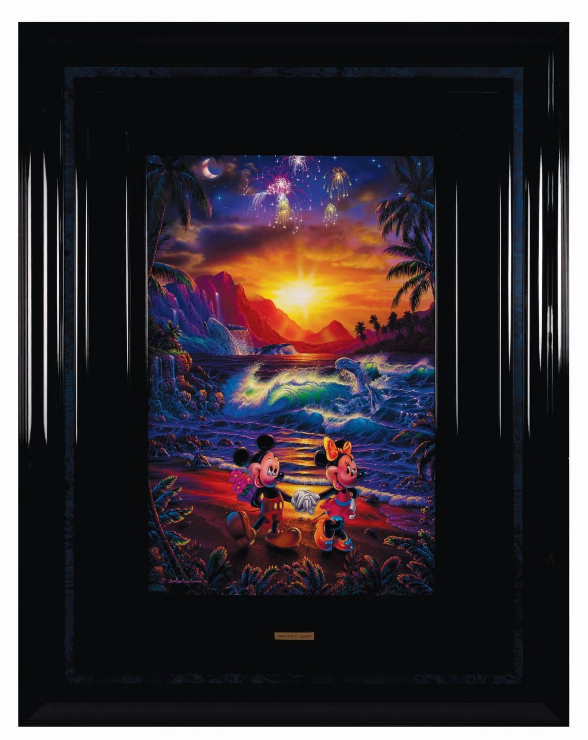 (Disney, 1996) An original painting by world-renowned marine artist Christian Riese Lassen featuring Mickey Mouse and Minnie Mouse. Accomplished in acrylic and airbrush on board, the painting depicts Disney's first couple sharing a romantic oceanside moment as the waves swell behind them and fireworks blossom above a blazing sunset. The hallmarks of Lassen's famed seascapes are inescapable, from his captivating use of vibrant color to his vivid celebration of oceanic flora and fauna. The artist has signed at bottom left, "Christian Riese Lassen." Interestingly, this painting was the object of a notorious Las Vegas art heist, stolen while on loan to a gallery in the Forum Shops section of Caesars Palace. Both Seaside Romance and its companion, Sorcerer of the Sea (Lot #78), were stolen, with the thief making a clean getaway. The paintings were soon fenced to an unsuspecting collector, who subsequently came forward and returned the work to the Forum gallery, which in turn restored the art to Lassen. They were later sold legitimately through Lassen's own gallery in Hawaii. One of the artist's most recognizable works, this painting has inspired popular limited editions in multiple formats, and has been featured in a variety of Disney merchandise. Measuring 30.25"x20.25" within a 46.25"x36.25" black wood shadowbox gallery frame, the piece is in fine condition with some light crazing in Mickey's ear. Proceeds from the sale of this lot will benefit Ronald McDonald House Charities of Greater Las Vegas.