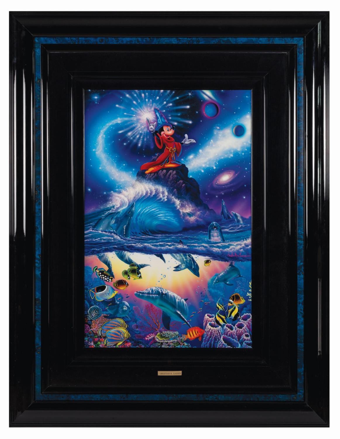 (Disney, 1995) An original painting by world-renowned marine artist Christian Riese Lassen featuring Sorcerer Mickey. Accomplished in acrylic and airbrush on board, the painting depicts Mickey atop a sea rock, conjuring cosmic energies, as a school of dolphins and tropical fish cavort beneath the water's surface. This striking juxtaposition highlights the interconnectedness of biological systems and natural forces, a recurring theme in Lassen's work, and the use of arrestingly vibrant colors both in the heavens and under the sea connects and highlights the exotic wonders of these unexplored frontiers. The artist has signed at bottom left, "Christian Riese Lassen." Interestingly, this painting was the object of a notorious Las Vegas art heist, stolen while on loan to a gallery in the Forum Shops section of Caesars Palace. Both Seaside Romance and its companion, Sorcerer of the Sea (Lot #77), were stolen, with the thief making a clean getaway. The paintings were soon fenced to an unsuspecting collector, who subsequently came forward and returned the work to the Forum gallery, which in turn restored the art to Lassen. They were later sold legitimately through Lassen's own gallery in Hawaii. One of the artist's most recognizable works, this Disney commission has inspired popular limited editions in multiple formats, as well as a poster. It has also been featured on coffee mugs and a multitude of Disney merchandise. Measuring 30.25"x20.25" within a 46.25"x36.25" black wood shadowbox gallery frame, the piece is in fine condition with some crazing and wear at top center. Proceeds from the sale of this lot will benefit Ronald McDonald House Charities of Greater Las Vegas.
