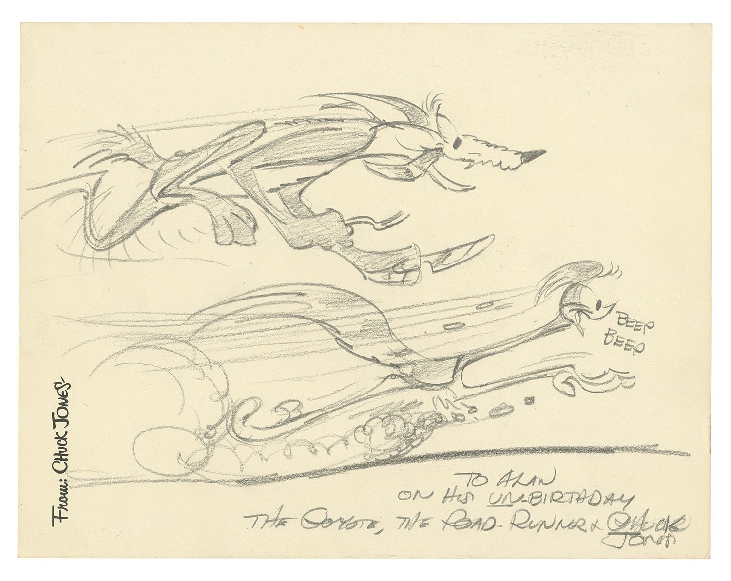 (Warner Bros., c.1980) An original drawing by animation legend Chuck Jones. Best known for his work with Warner Bros' Looney Tunes and Merrie Melodies shorts for characters including Bugs Bunny, Daffy Duck, Porky Pig, and many more, Jones also brought life to the popular duo, the Roadrunner and Wiley E. Coyote. Accomplished in pencil on Jones' personal stationary, the drawing is personalized with a message to a fan, Alan, and signed by Jones in the lower-right corner. Measuring 8.5"x11", the drawing is in very good condition with minor wear.