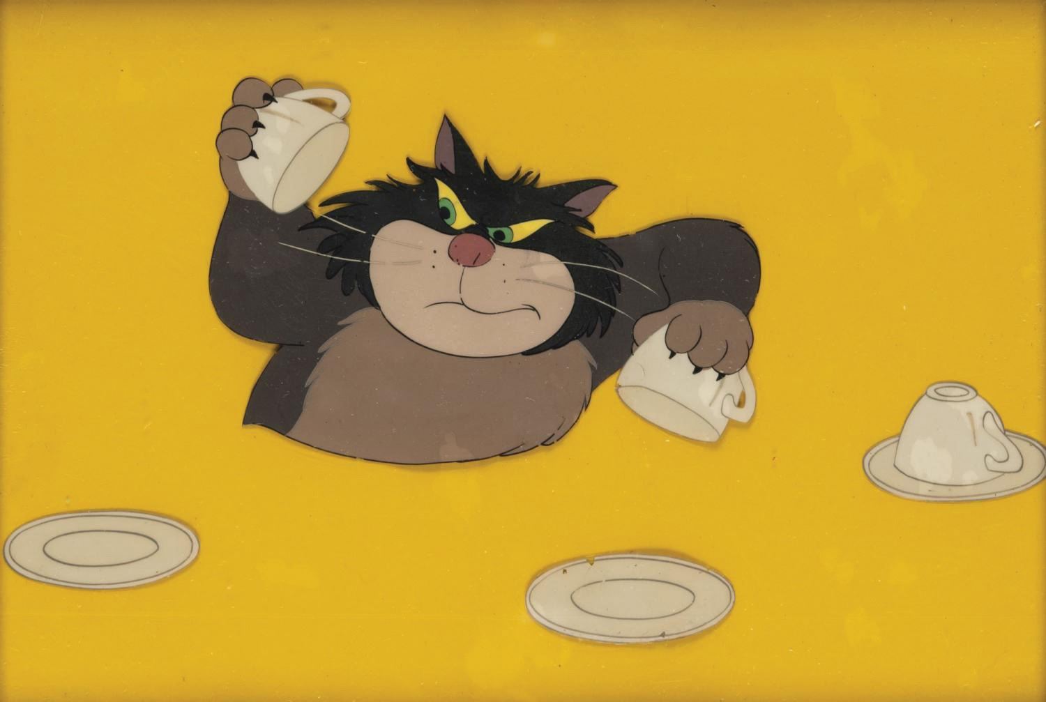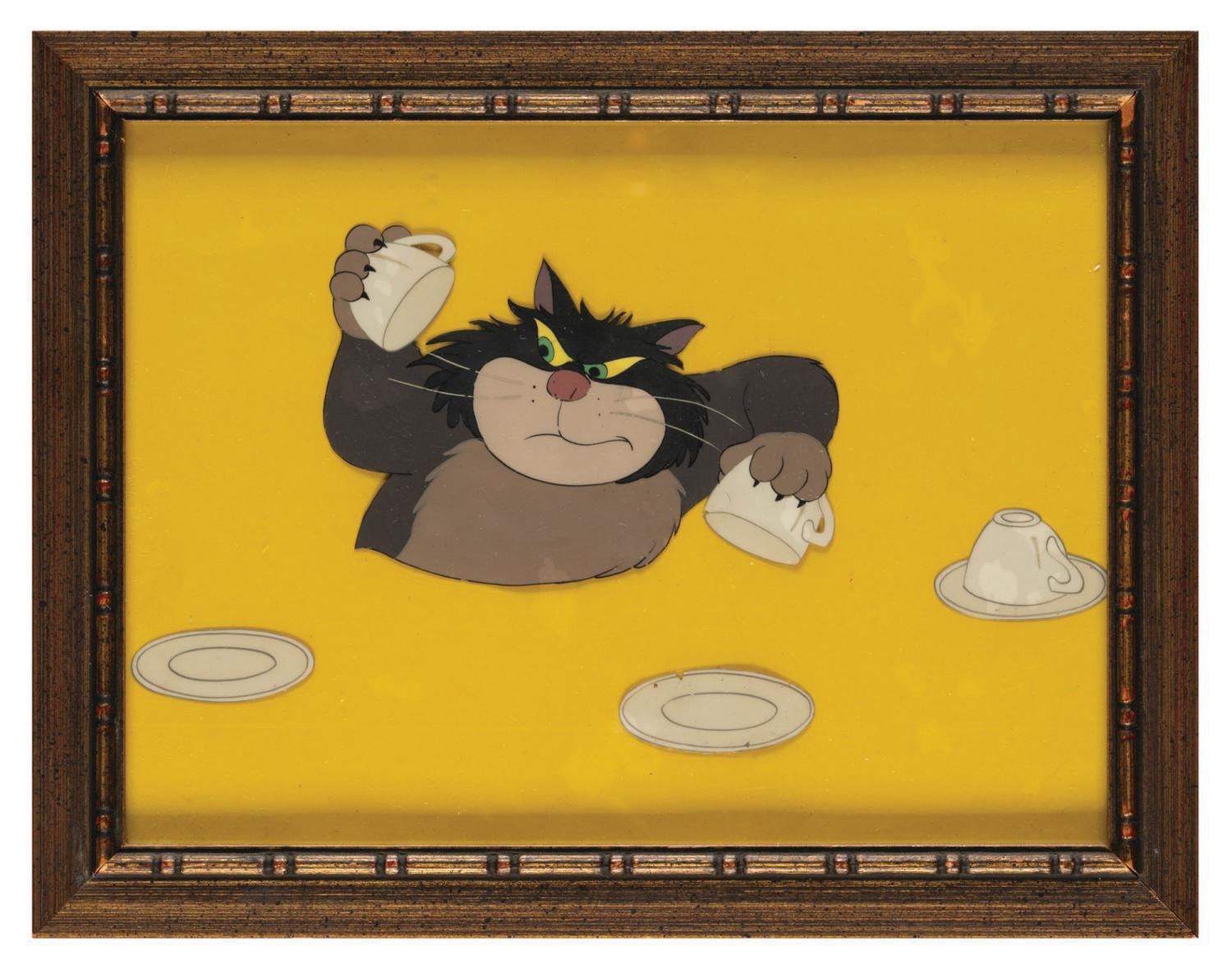 (Disney, 1950) An original hand-painted production cel of Lucifer the cat from the animated feature film Cinderella. In this sequence, Lucifer, the Tremaine family's mischievous  cat, engages in the old "shell game," as he searches for Gus the mouse under several teacups. The piece has a painted image size of 4.75"x8" on its 6"x8" trimmed cel sheet. It is contained within a 7.5"x9.5" frame. The condition is good with several small spots of paint wear or minor paint lifting.