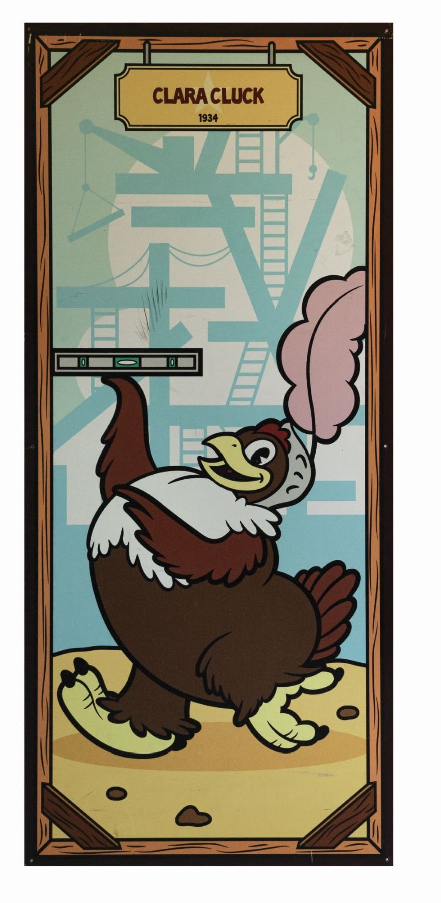 (California Adventure, c.2011) An original construction billboard featuring Clara Cluck that was used during the refurbishment of Sunshine Plaza into Buena Vista Street. This billboard is part of a series of classic-style Disney characters used during the construction, and similarly styled billboards are still in use at the park today. Printed on a thin sheet of metal with a plastic core, the billboard measures 86.5"x38.5" and 1/8" thick. The condition is good with expected wear from use, including scratches and tape residue. This item will require special shipping arrangements. Please contact us for details and estimates.