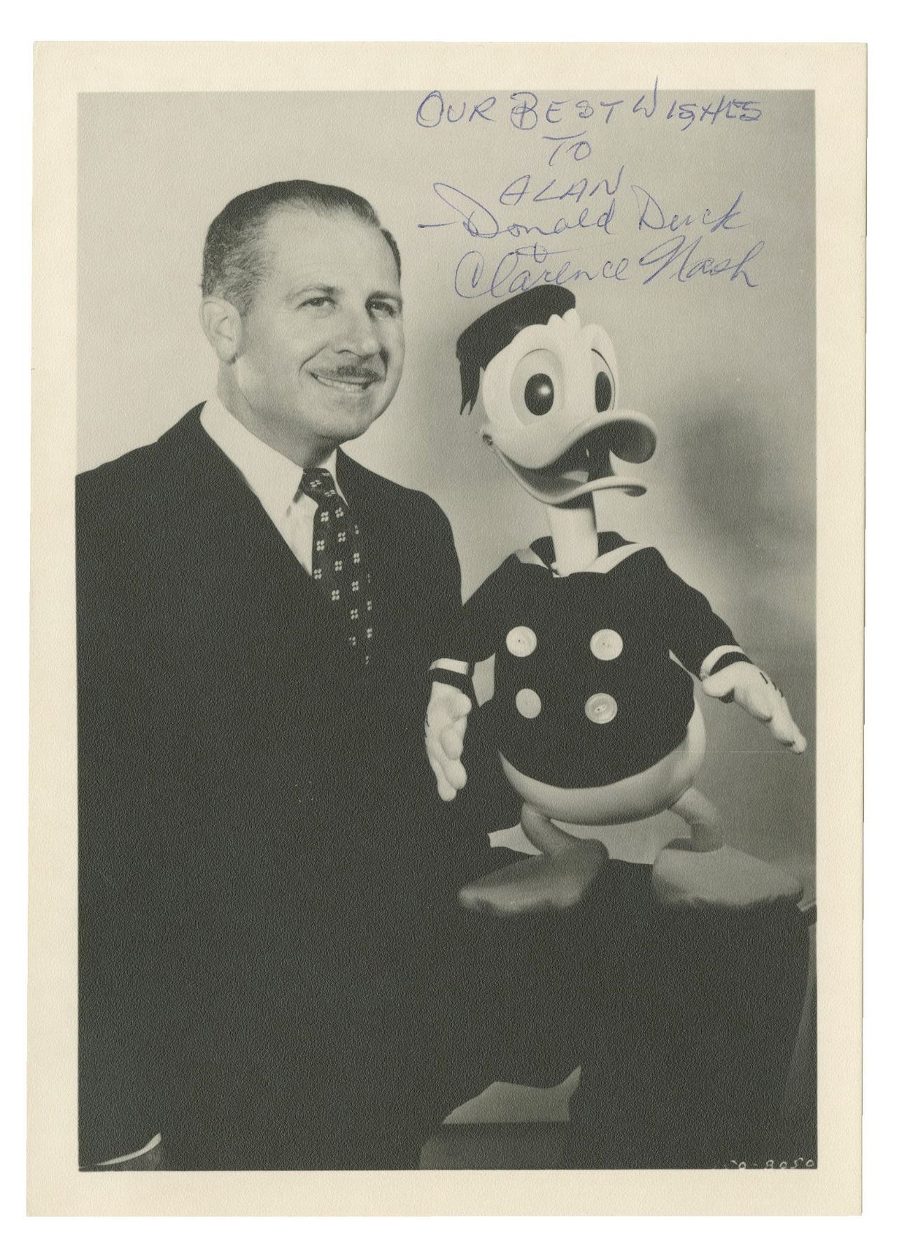 (Walt Disney Studios, c.1979) A black and white publicity photo of Disney Legend Clarence Nash, who voiced Donald Duck for over 50 years. Nash is seen in this photo with a large Donald Duck doll on his knee, and Nash has signed this photo "Our best wishes to Alan - Donald Duck & Clarence Nash." Measuring 7"x5", the photo is in very good condition.