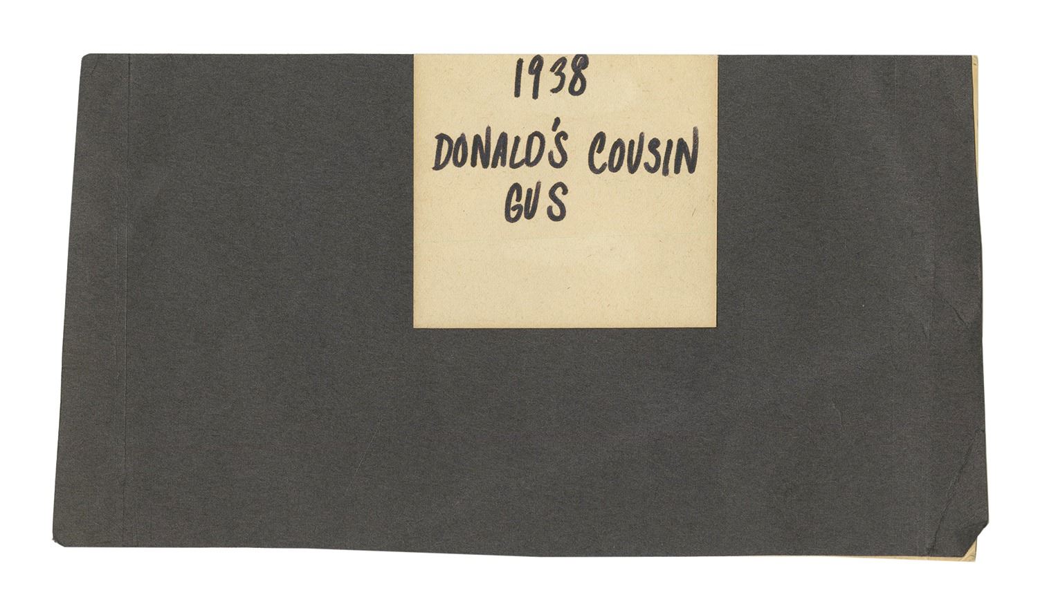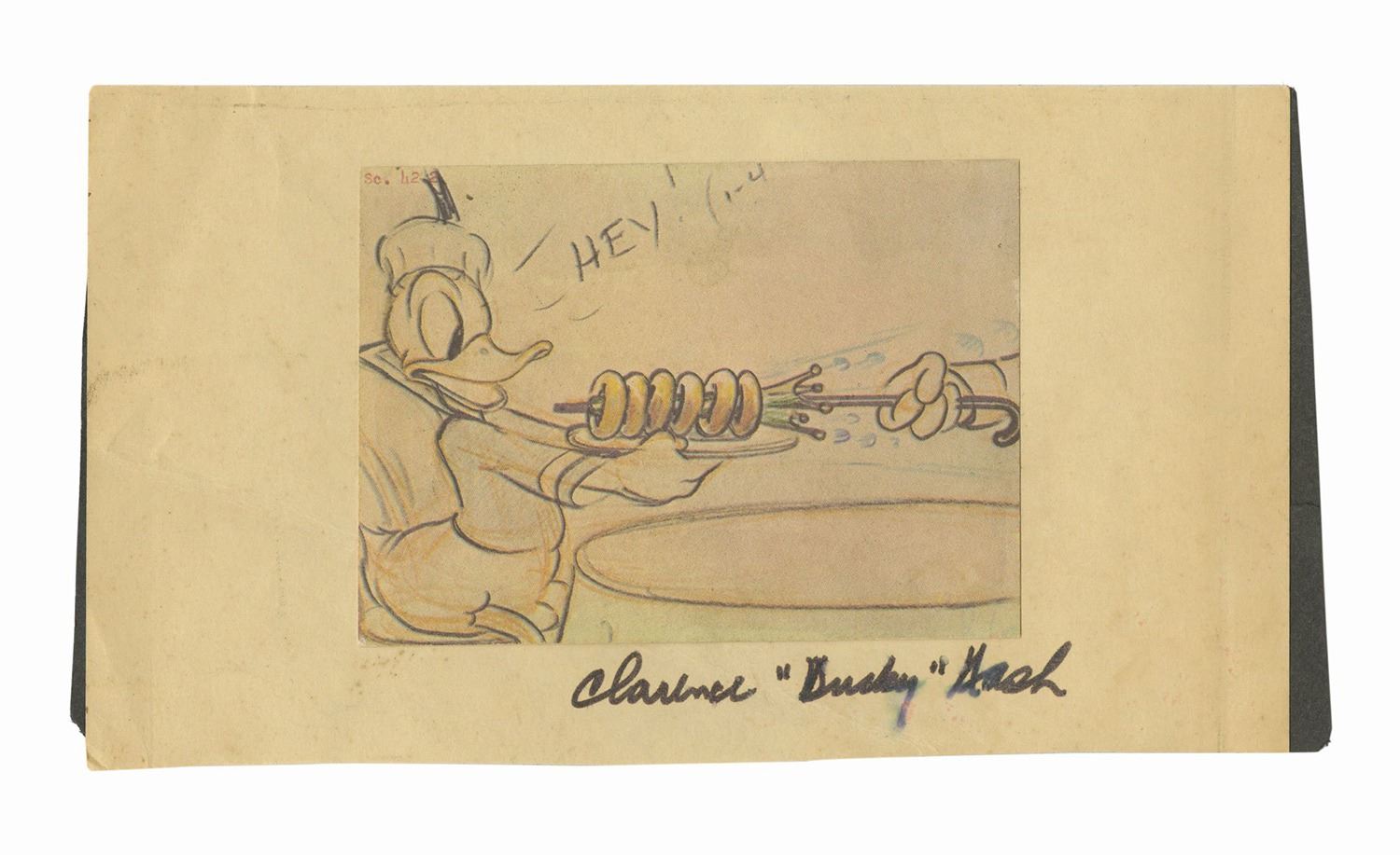 (Disney, c.1980s) A printed color storyboard panel from the Donald Duck theatrical short "Donald's Cousin Gus." The panel, depicting Donald angrily shouting as an offscreen figure steals his donuts, is affixed to a sheet of cream-colored backing paper which itself is backed with construction paper for reinforcement. Below the image, the backing paper has been signed in black felt pen by legendary Donald Duck voice actor Clarence "Ducky" Nash. The storyboard measures 3"x4" on the 4"x7.5" construction paper. In good condition overall, the signature exhibits smearing to the "y" in Ducky and the backing paper exhibits some yellowing from age and minor soiling.