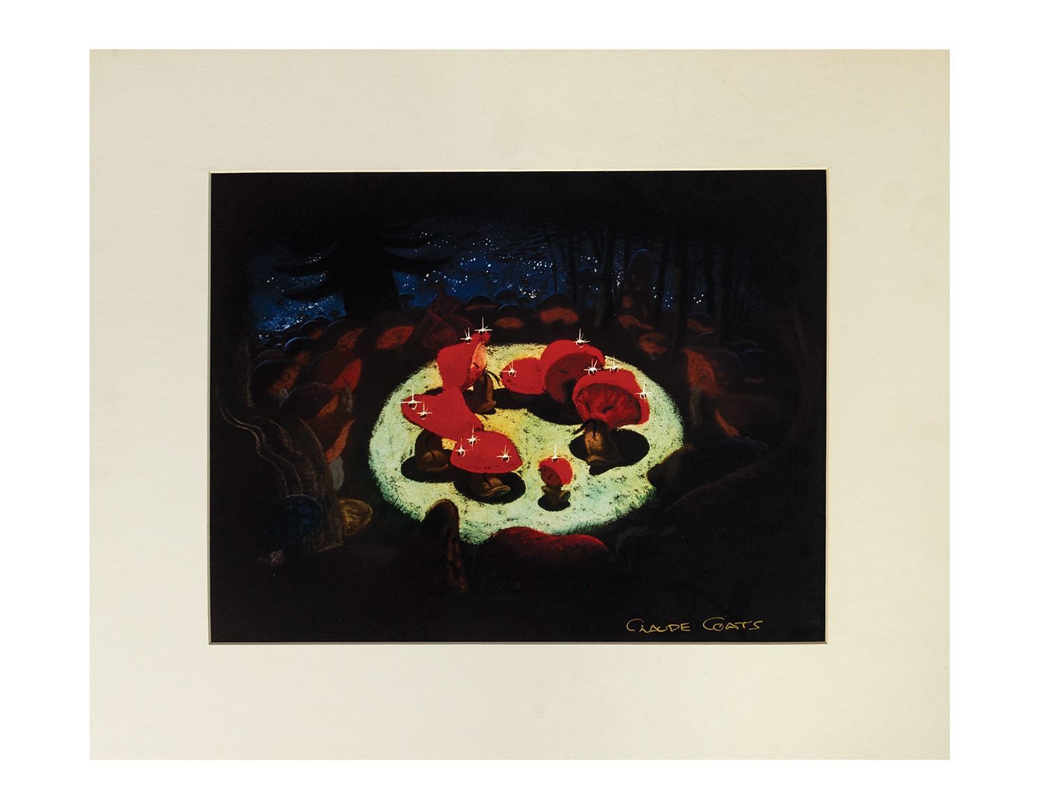 (Disney, c.1980s) A signed print featuring the dancing mushrooms from Walt Disney's Fantasia. The print is signed by Disney Legend Claude Coats, who worked as a background artist on the film. The print has an image size of 10.5"x13.5" within a 16"x19" mat frame and the condition is very good.