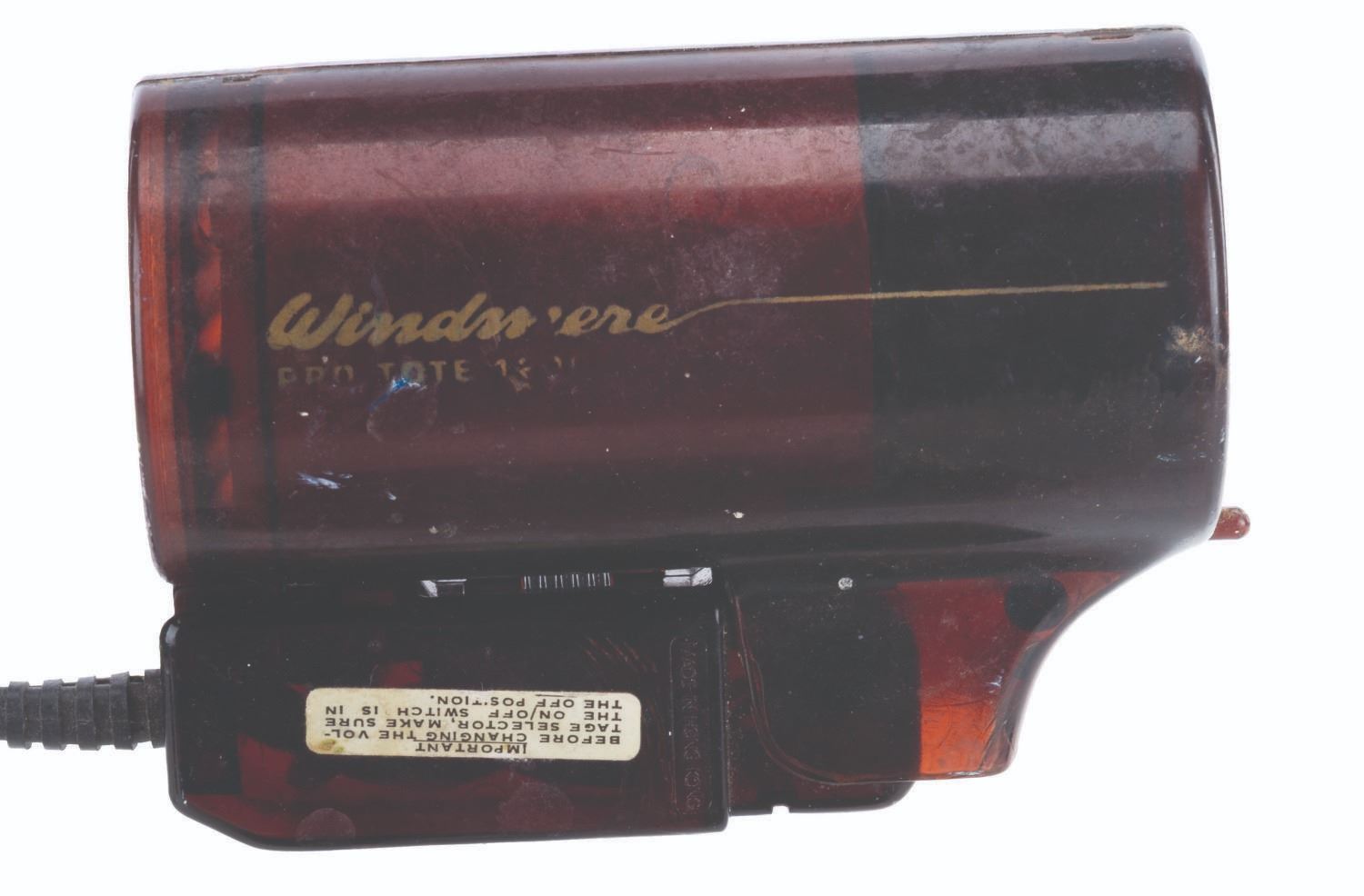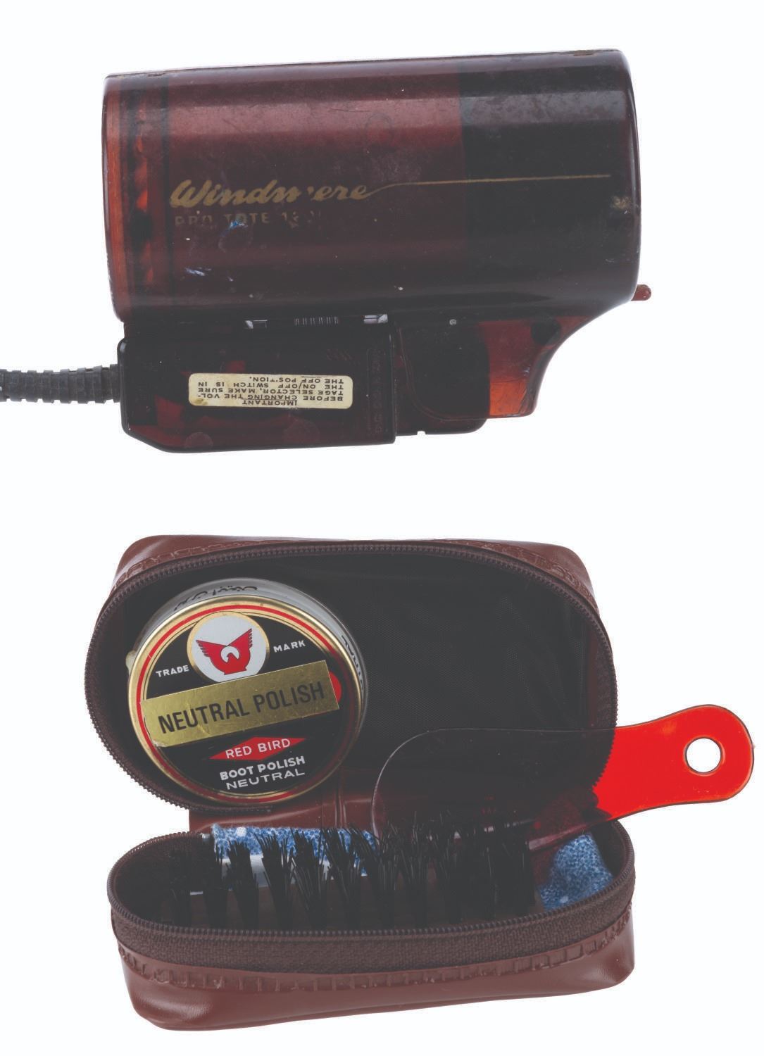 (Clint Eastwood, 1970s-80s) A Windmere Pro Tote 1200 mini hair dryer and Red Bid boot polish kit from the estate of Clint Eastwood. Ranging in size from 2.25” in diameter to 3.5” x 5” x 2.5” in diameter, the items are in fair to good condition with scratches, scuffs, stains, and wear from use.