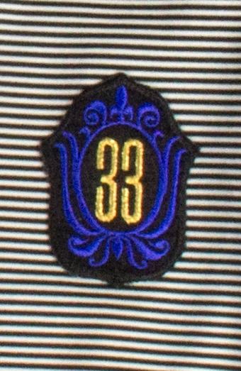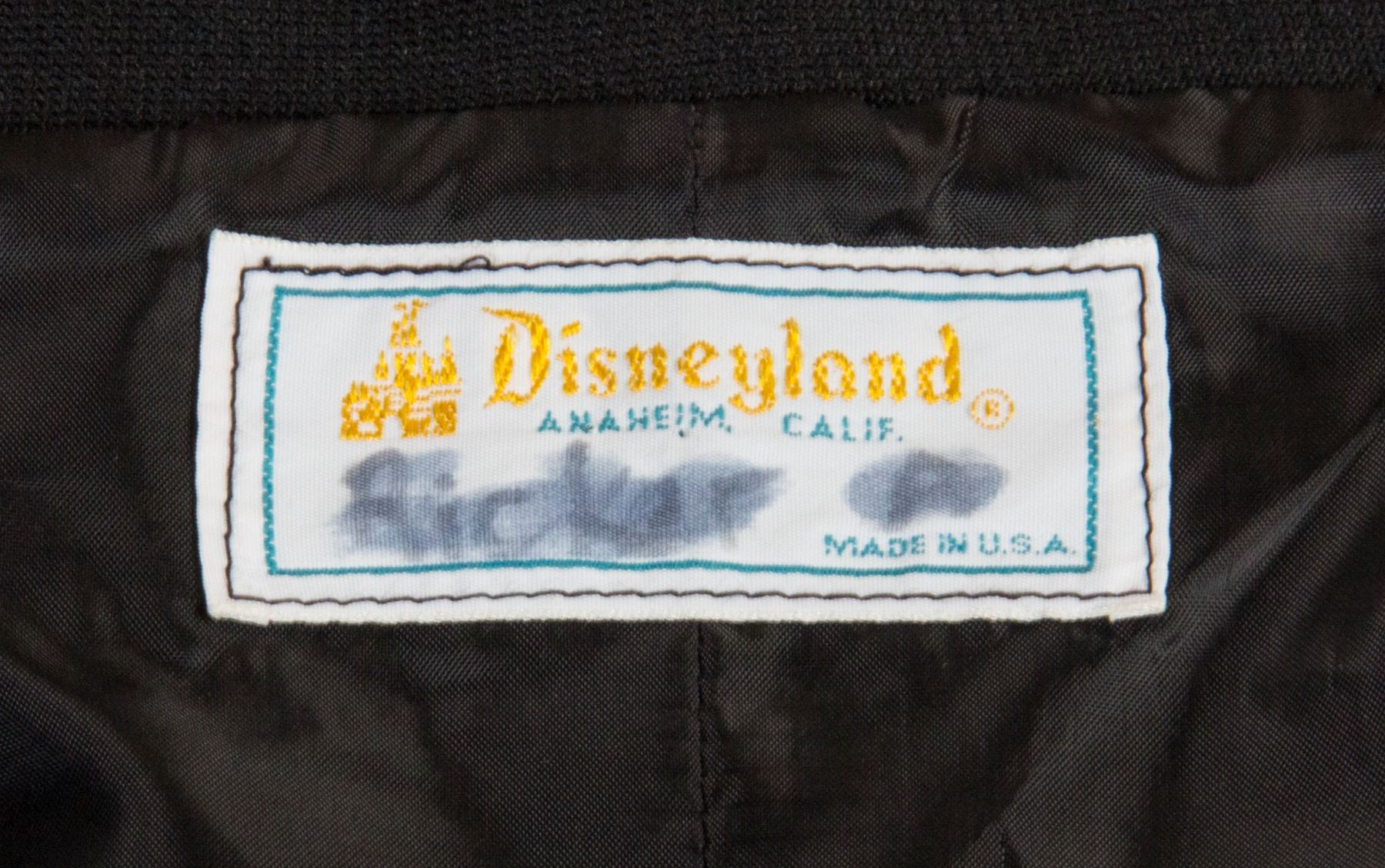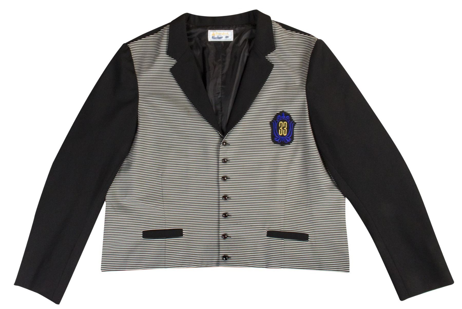 (Disneyland, c.1967) An original cast member jacket from Disneyland's exclusive "Club 33". This very early style jacket features a patch on the chest with the club's logo and a black and white striped pattern for the fabric in the chest. The inside-collar still retains the original Disneyland wardrobe label, and small details such as the deep red buttons help make this a very appealing piece of cast member wardrobe. Vintage items from "Club 33", and especially original cast member wardrobe, are very difficult to come by with this jacket beautifully representing the club's original iconic look. The jacket is unmarked for size but appears to be a men's XL, and the condition is very good with expected minor wear from use including the very bottom button being replaced.