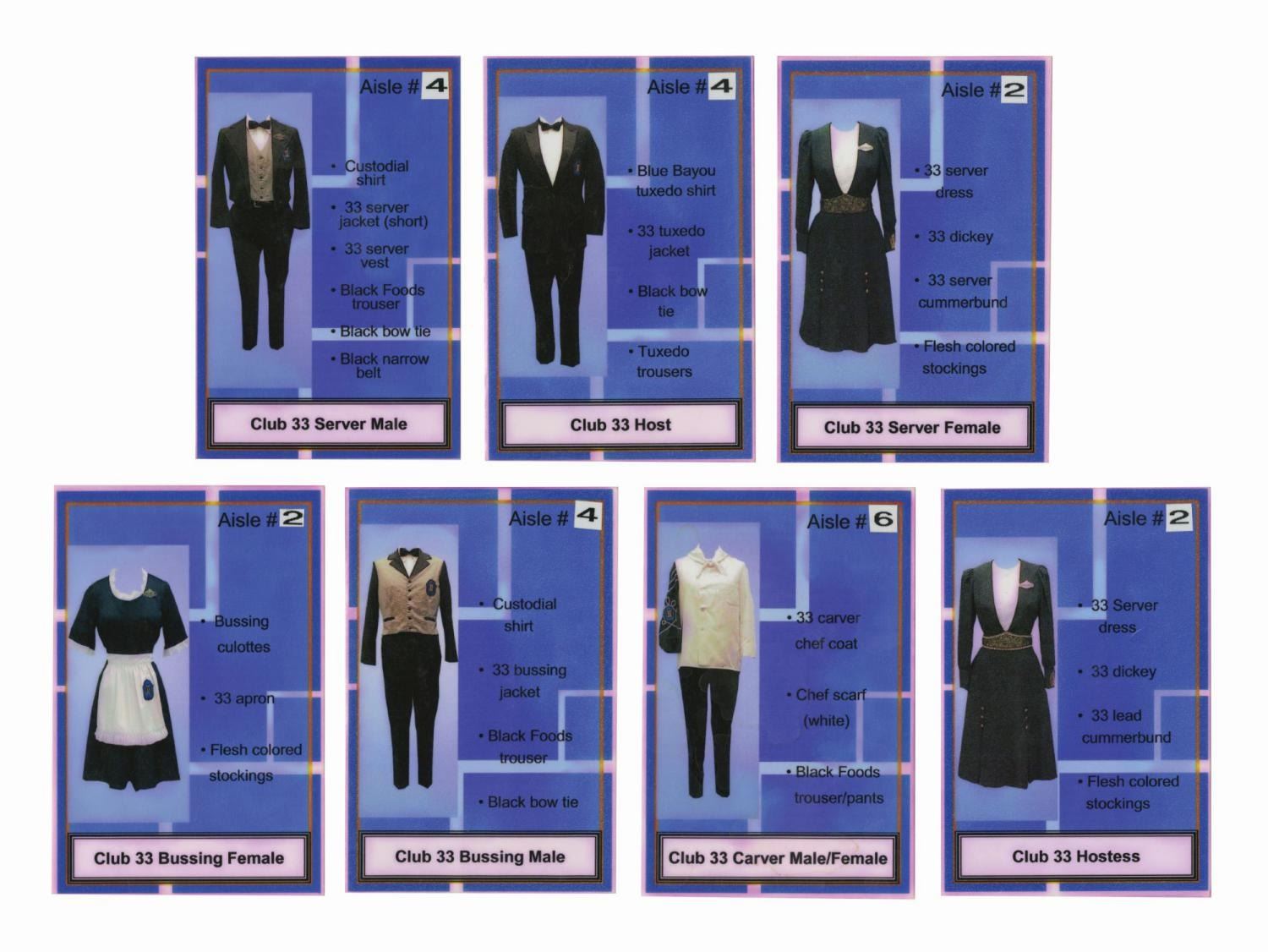 (Disneyland, c.2000s) A collection of (7) wardrobe guide cards for Club 33 cast member costumes. Each card depicts a different cast member costume and provides a list of the clothing articles from which it is comprised. The cards include the Club 33 Bussing Female, Server Male, Host, Server Female, Carver Male/Female, Bussing Male, and Hostess. Used as rack labels in the wardrobe department, every card lists the number of the aisle where the pictured garments can be found. Measuring 5.25"x3.5", the cards are in very good condition with minor wear. One card retains a square of velcro on the back.