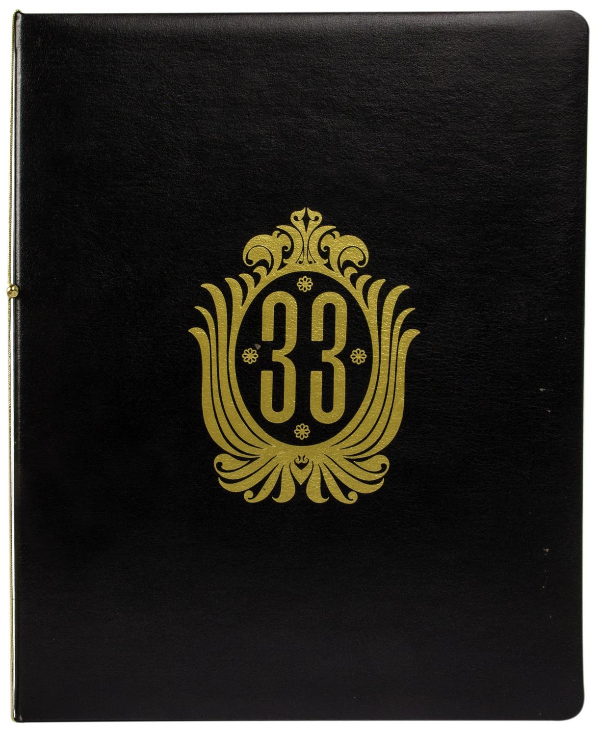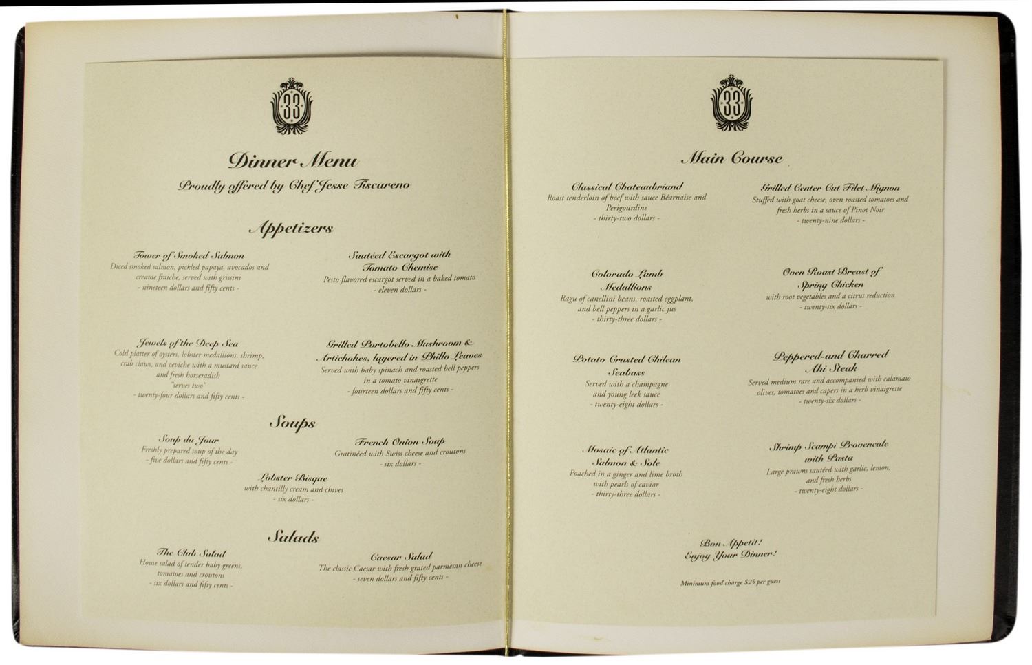 (Disneyland, c.1990s) An original menu with menu cover from Disneyland's "Club 33". The 12.75"x10" dinner menu features the club's logo on the two interior pages as well as the cover, and lists the club's popular meal options. The condition is very good with minor wear from use.