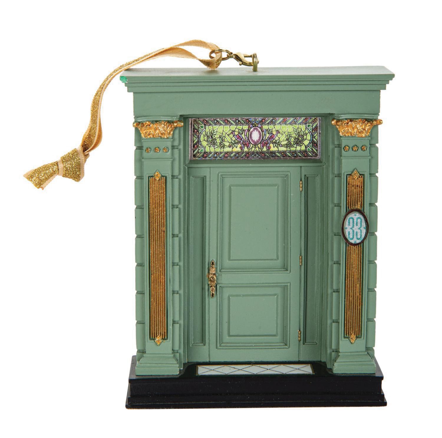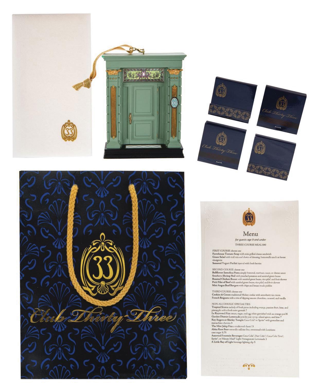 (Disneyland, 2015) A Club 33 Members Only open edition ornament of the Club's gorgeous door. This full color recreation of the iconic entryway with "33" address plaque and stained-glass transom window measures 4.75"x3.75" and 1.25" thick. it is in good condition with a small chip on top. A set of (4) Club 33 Matchbook-style notepad party favors, a Club 33 microfiber paper towel, and a Club 33 embossed child's menu are all included, the latter exhibiting light wear, creasing, folds, and spots of discoloration.