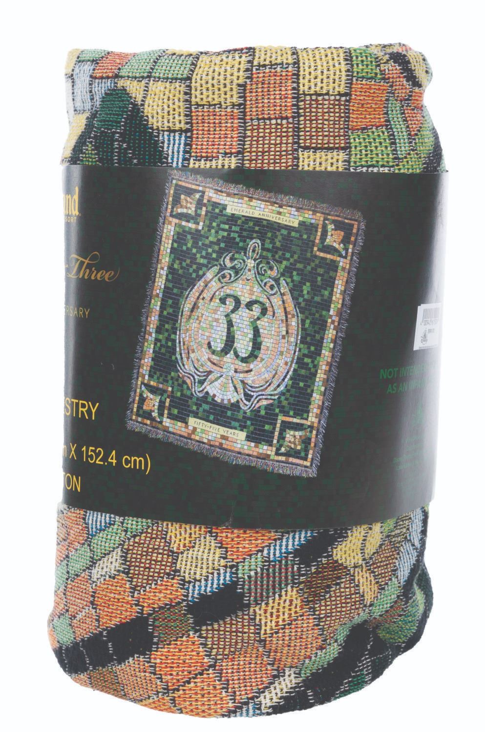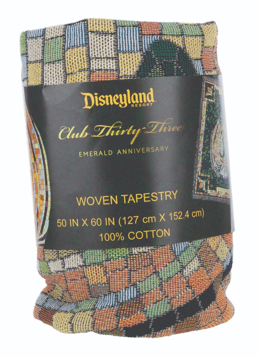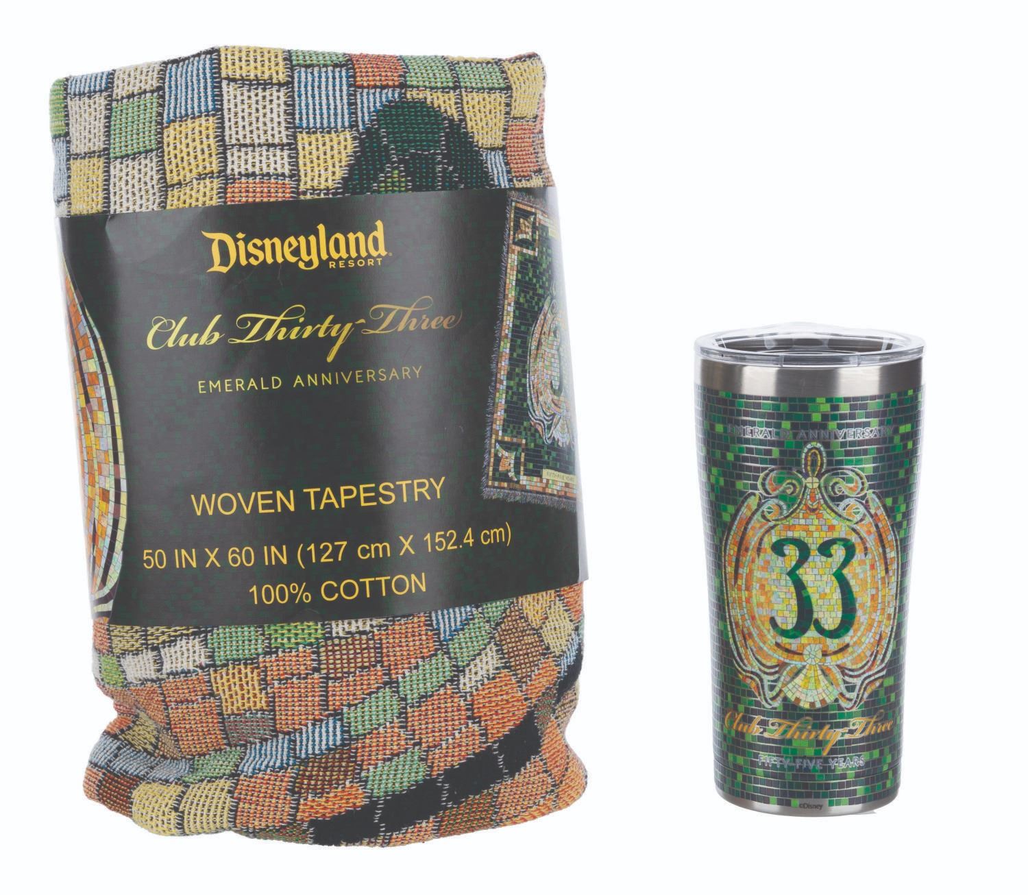 (Disneyland Resort, 2022) A Club 33 emerald anniversary Tervis tumbler and woven tapestry with a matching mosaic pattern. The 20 oz tumbler measures 7” tall and 3.5” in diameter while the unused 100% cotton tapestry measures 50” x 60”, in very good and fine condition respectively with light scratches on the tumbler lid.