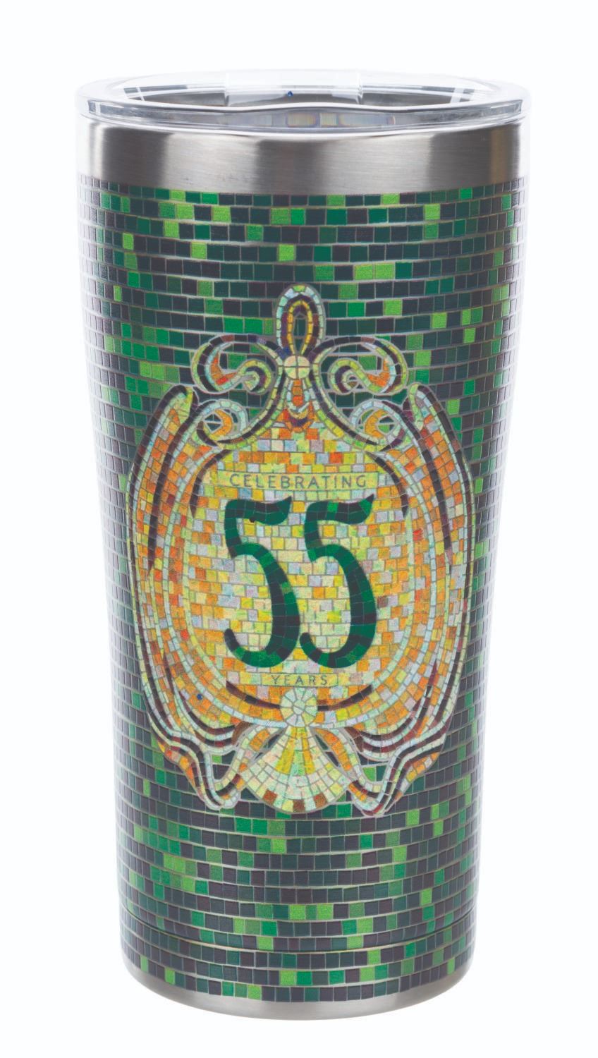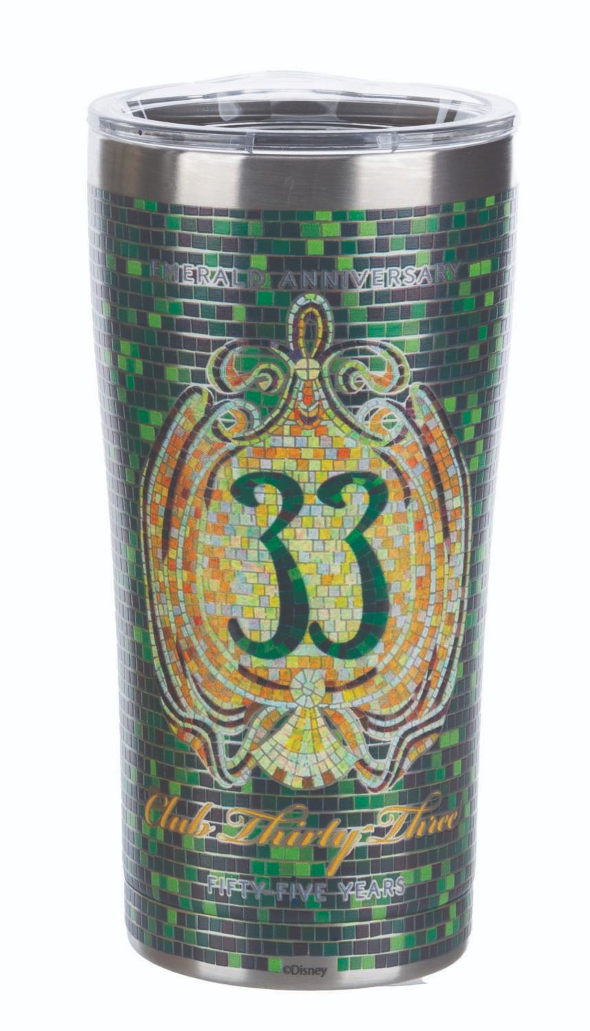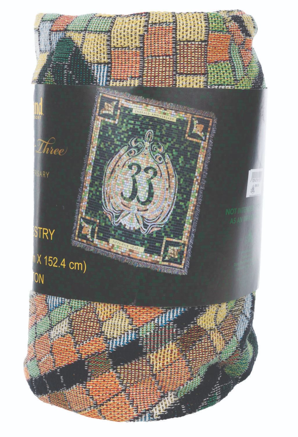 (Disneyland Resort, 2022) A Club 33 emerald anniversary Tervis tumbler and woven tapestry with a matching mosaic pattern. The 20 oz tumbler measures 7” tall and 3.5” in diameter while the unused 100% cotton tapestry measures 50” x 60”, in very good and fine condition respectively with light scratches on the tumbler lid.
