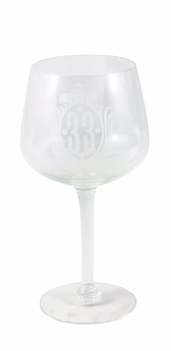(Disneyland, c.2000s) A set of glassware from Disneyland's exclusive "Club 33". This set includes (8) glasses of various styles, all of which feature the "Club 33" logo on the front. The glasses range in size from the 3" tall shot glass to the 9" tall wine glass. The condition is very good with minor wear.