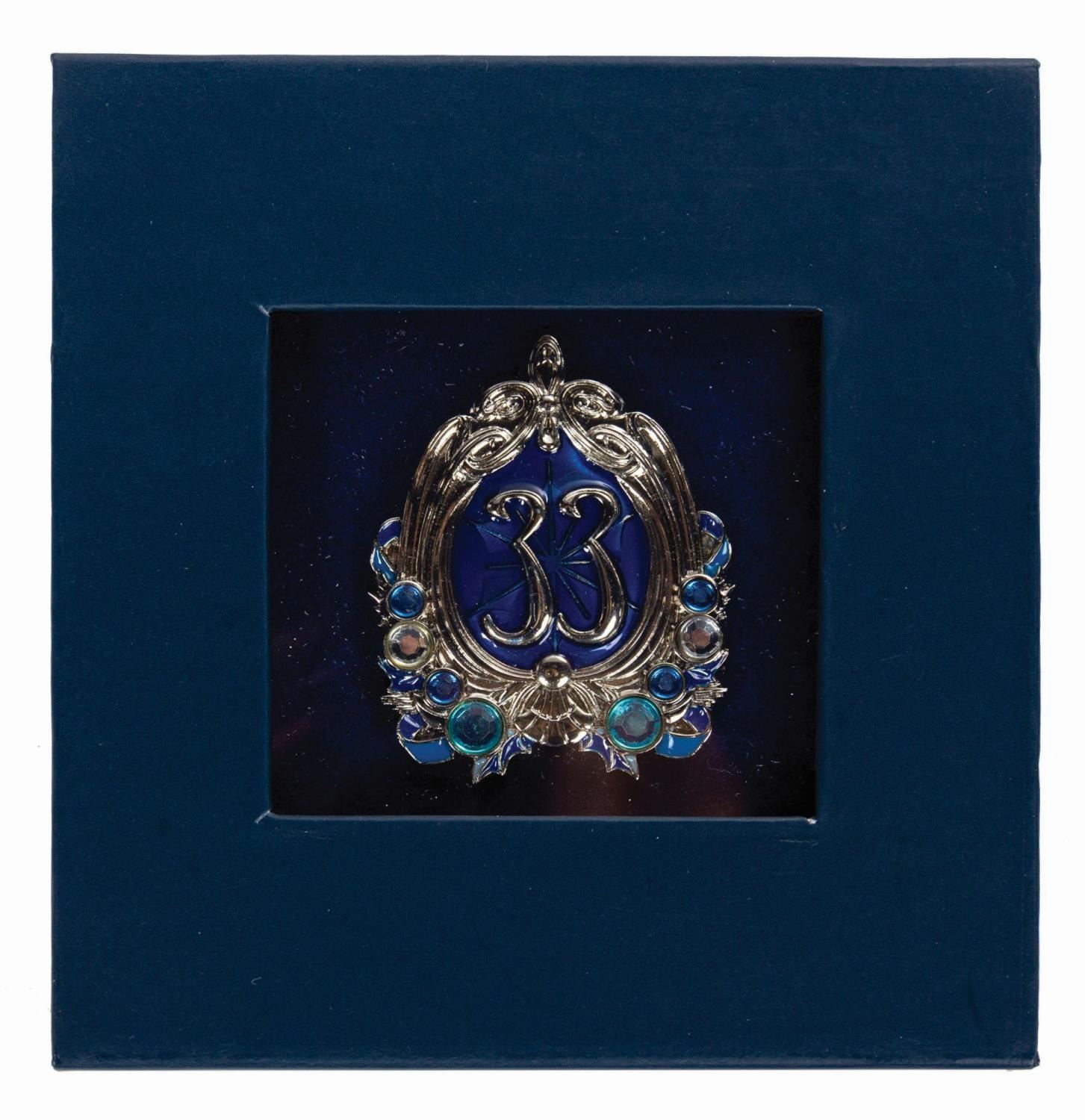 (Disneyland, 2018) A beautiful limited edition Club 33 pin released for the 2018 holiday season. This blue and silver pin showcases the Club 33 logo, with additional details around the edges designed to look like ribbons and holly, with faux crystal accents. Released in an edition of 1000, the pin measures approximately 1.75"x1.5" in its 4"x3.75" and 1" tall original box. The condition is fine with minimal wear.