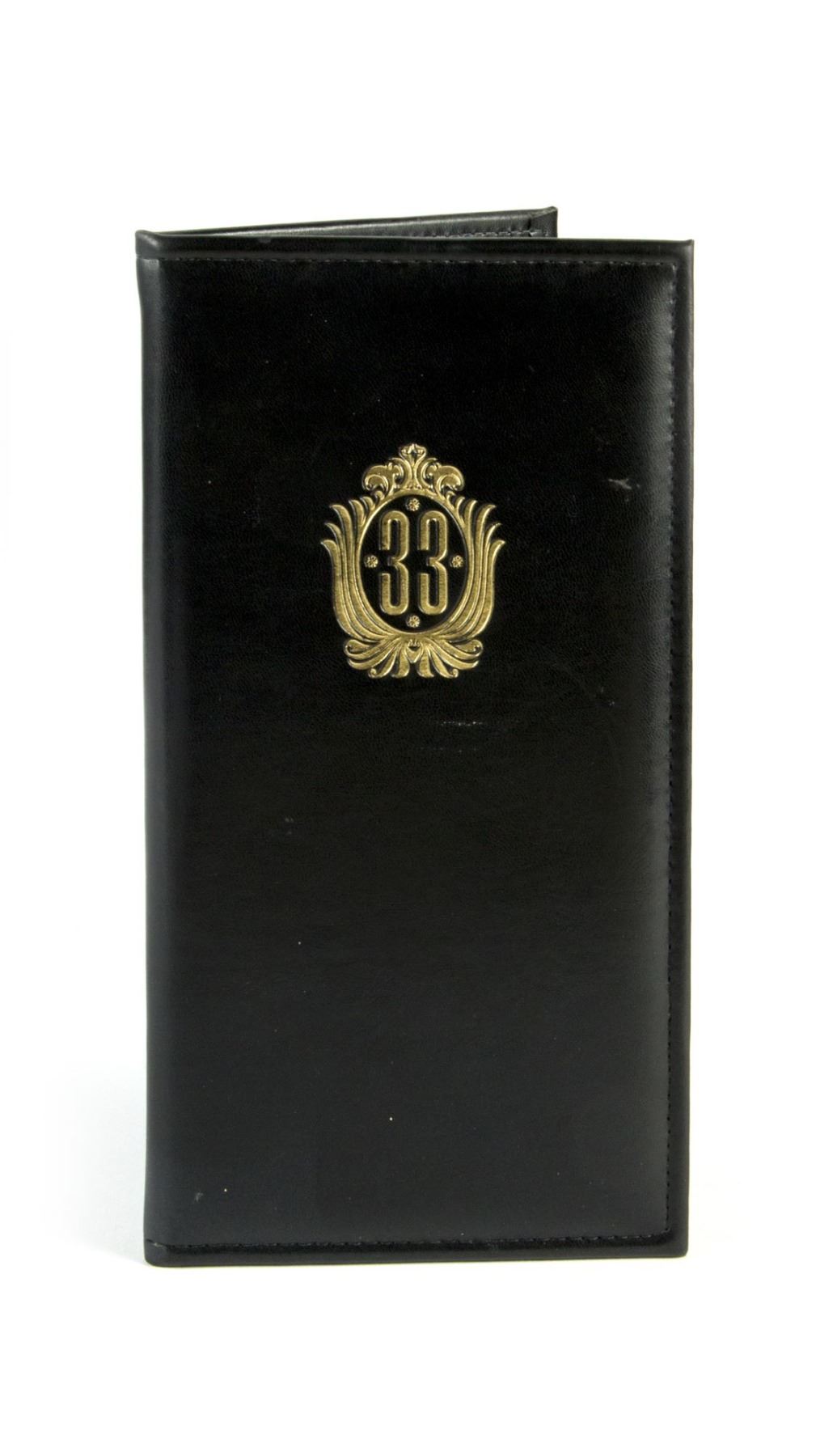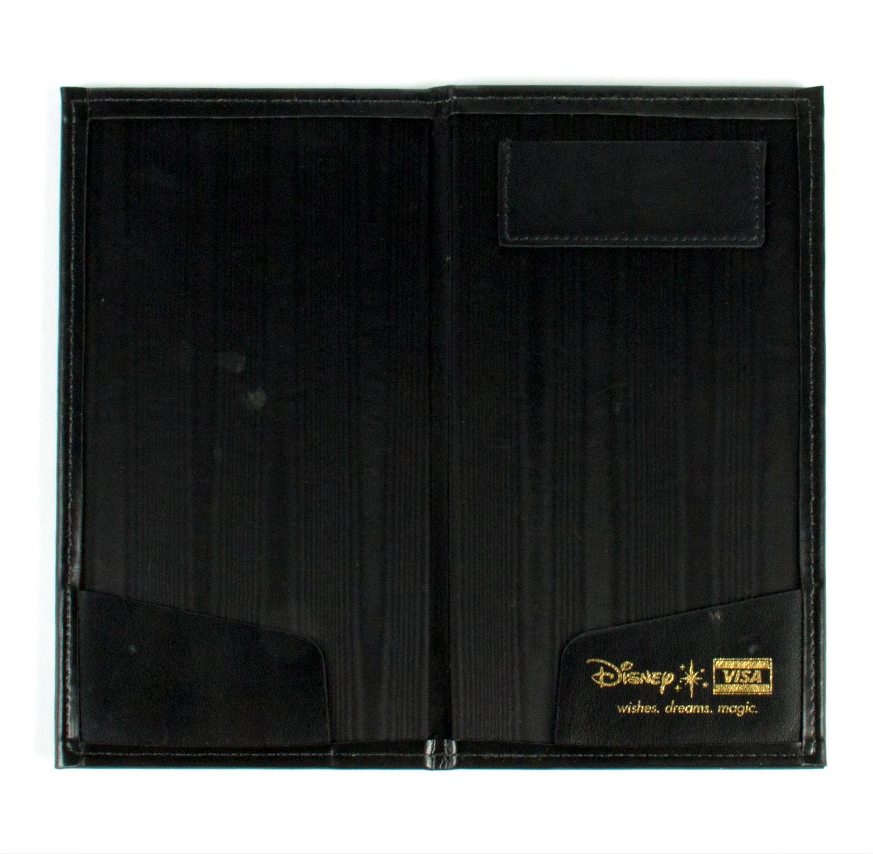 (Disneyland, c.2000s) A padded check holder from Disneyland's exclusive "Club 33". The gold and black check holder features the club's logo on the front and the Disney and Visa logos inside. Measuring 10.75"x5.75", the check holder is in very good condition with some minor wear from use.