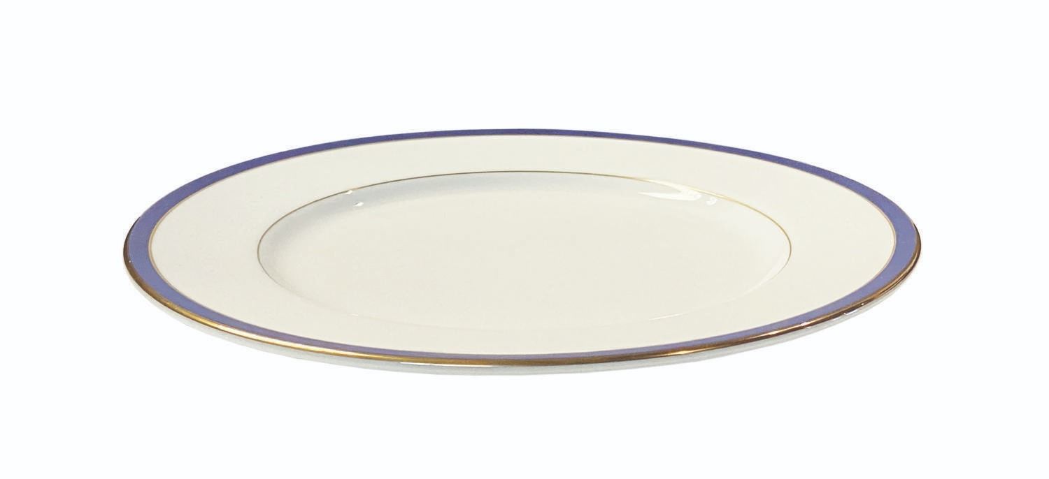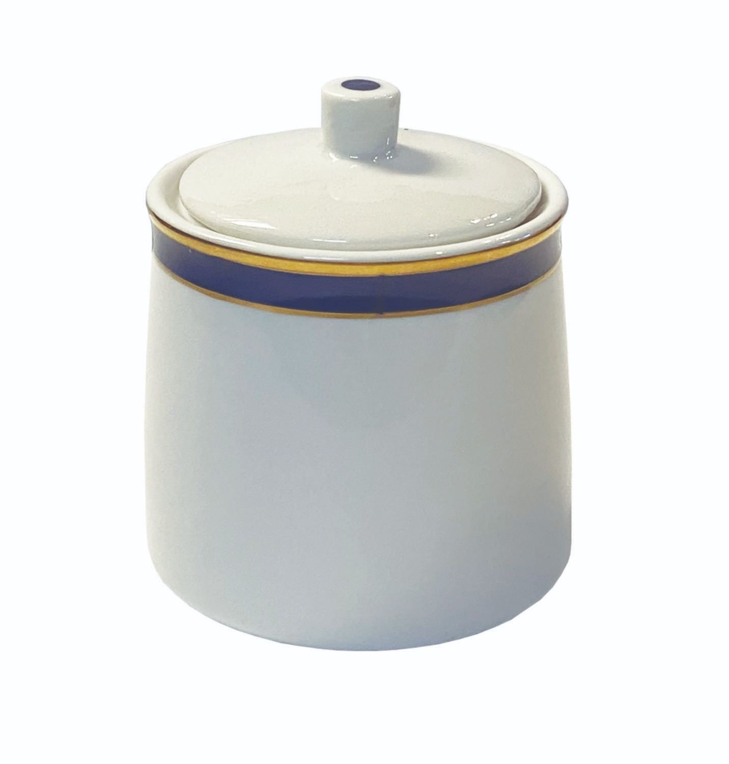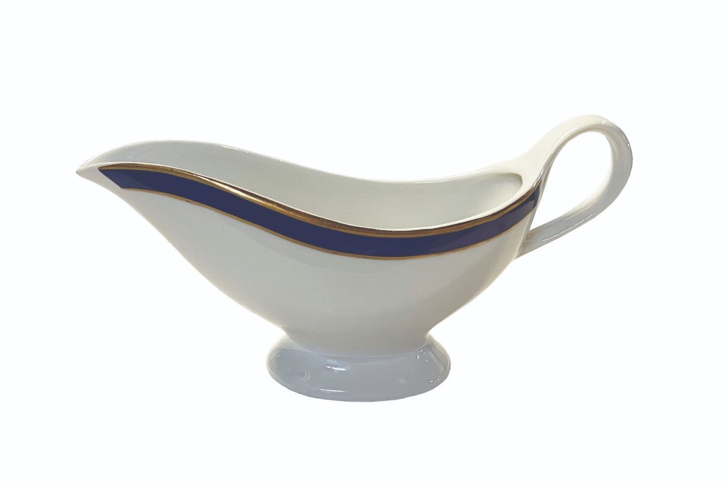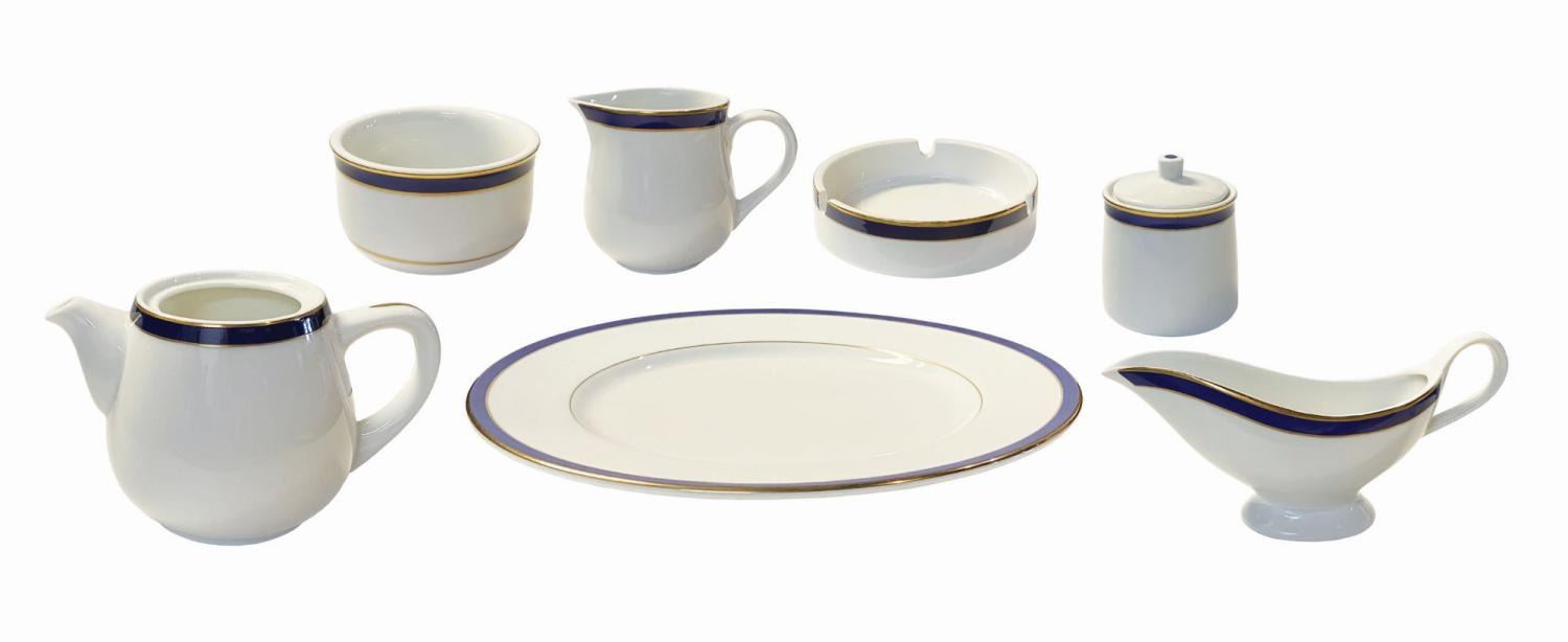 (Disneyland, c.1990s) A collection of (7) pieces of Club 33 exclusive tableware created by Michael Leson Designs including a dinner plate, a coffee cup, a gravy boat, a cream pitcher, a tea pot, a lidded sugar pot, and an ashtray. All pieces feature the elegant gold band and navy blue stripe pattern with additional gold accents. Each is marked on the bottom of the base with the Michael Leson for Club 33 maker's statement. Ranging in size from 3.25"x4" and 2.5" deep to 1" tall x 11" in diameter, the pieces are in generally very good condition with only minor wear to the bottoms from use in the Disneyland members only establishment. The tea pot is missing its lid.