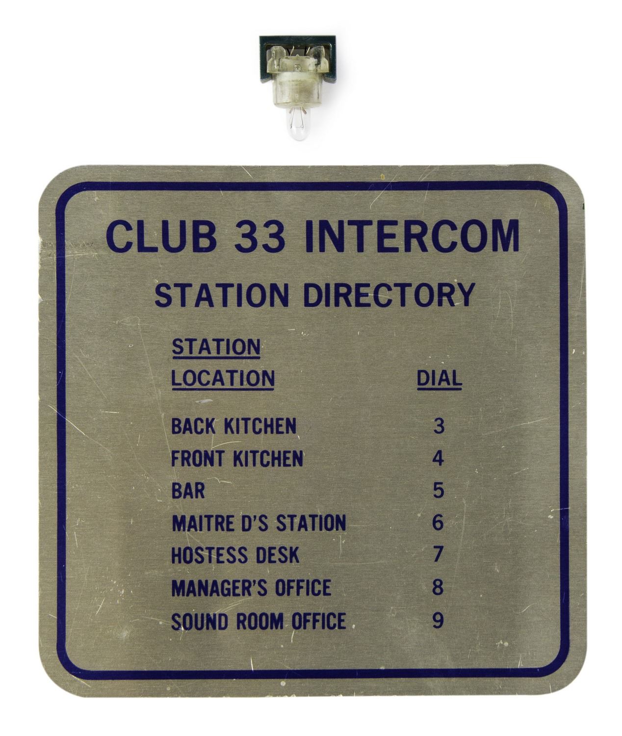 (Disneyland, 1967) A very rare intercom sign from Disneyland's exclusive "Club 33" used during the club's opening year in 1967. The sign features the Station Directory information for the intercom including the kitchen, bar, Maitre D's station, and more. This lot includes an original light bulb used in the club's intercom system. The sign measures 4.25"x4.25" while the bulb measures 0.75" tall. These items are in good condition with some wear from use, including some light scratching and wear from use.