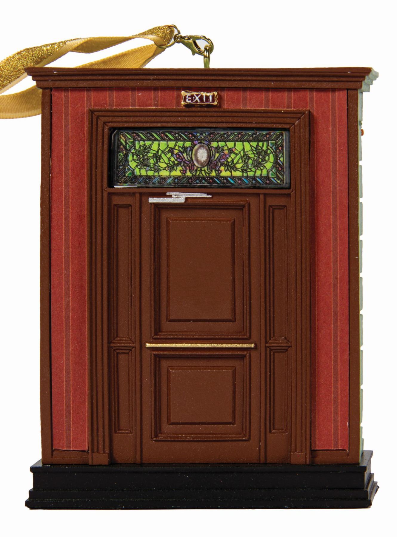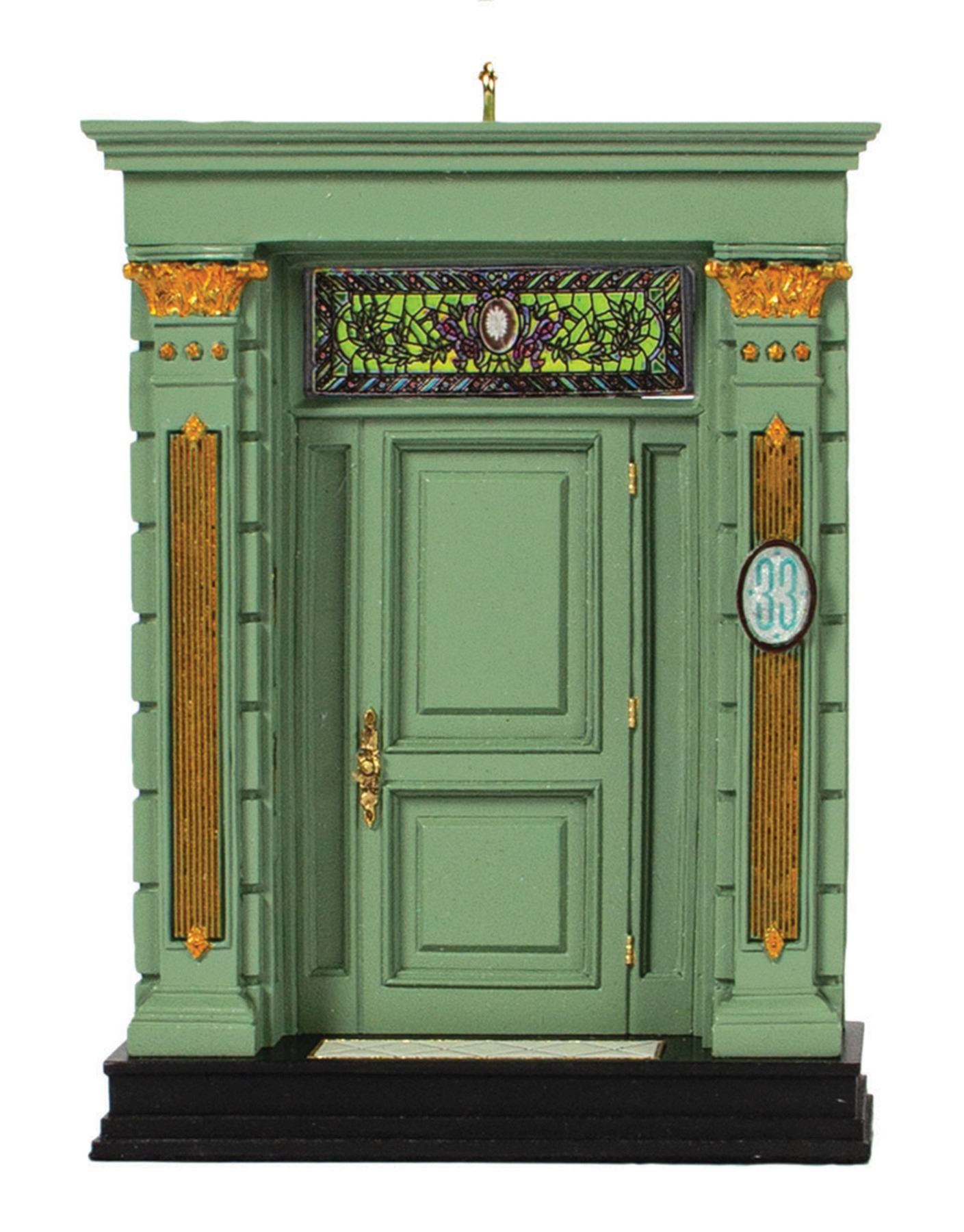 (Disneyland, 2015) A Club 33 exclusive Christmas ornament in the form of the original entrance door to the members only organization, designed by Adam Throgmorton. The cast resin ornament features plastic “stained glass” window above the door frame and replicates the club entrance on one side and the exit from the club to the park on the other, as they appeared in the late 1960s when Club 33 was founded. The piece is accompanied by its original cardboard box packaging. Measuring 4.5”x3.75” and 1” deep, the ornament is in very fine condition.