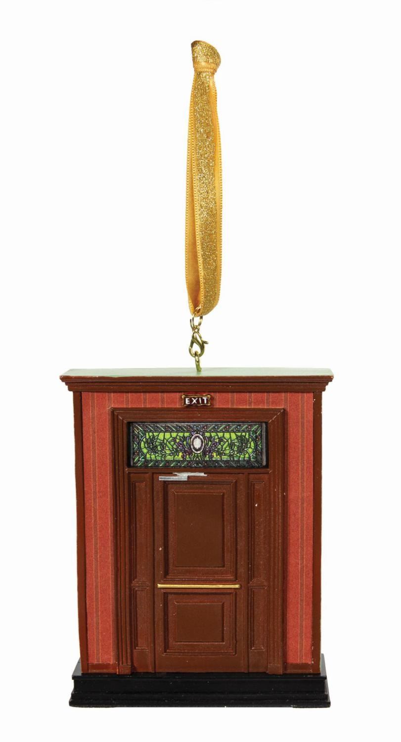 (Disneyland, 2015) A Club 33 exclusive Christmas ornament in the form of the original entrance door to the members only organization, designed by Adam Throgmorton. The cast resin ornament features plastic "stained glass" window above the door frame and replicates the club entrance on one side and the exit from the club to the park on the other, as they appeared in the late 1960s when Club 33 was founded. The piece is accompanied by its original cardboard box packaging. Measuring 4.5"x3.75" and 1" deep, the ornament is in very good condition, with small cracks to the top of the ornament at the back left and front right corners.