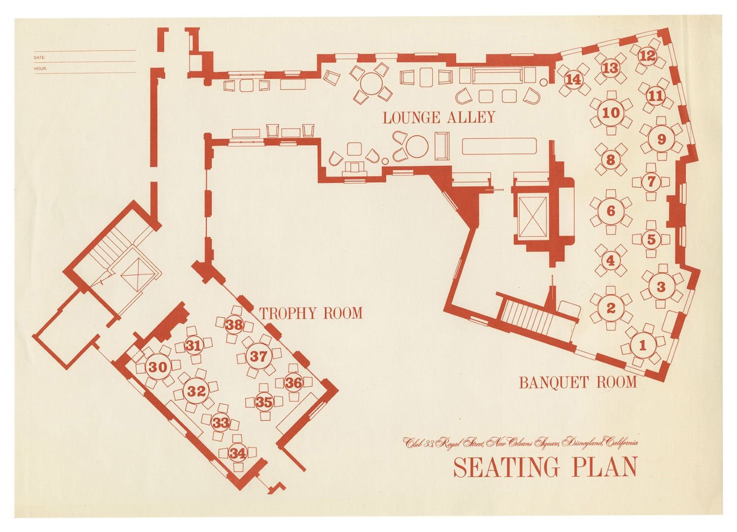 (Disneyland, c.1967) A seating plan for Club 33 in New Orleans Square. The seating plan features the layout of both dining areas with table numbers indicated, as well as the lounge alley and the popular Trophy Room. Measuring 10"x14", the map is in very good condition with some creasing by the upper corners.