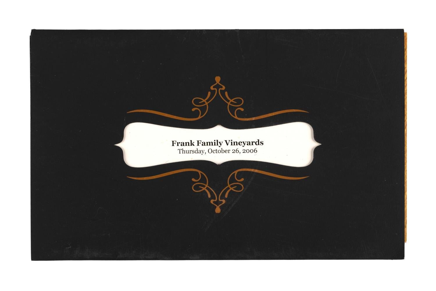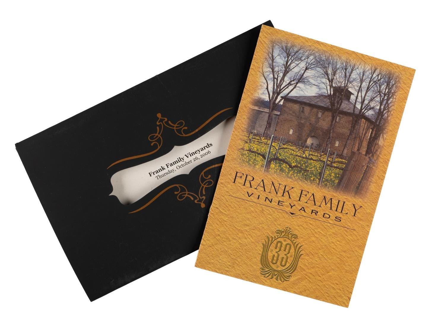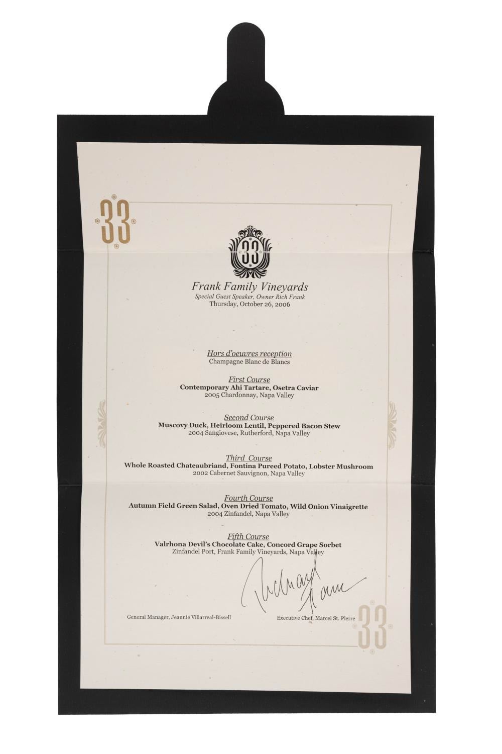 (Disneyland, 2006/2011) An invitation and menu from two events related to Frank Family Vineyards and Club 33 at Disneyland. The menu is signed by Richard Frank, owner of Frank Family Vineyards. Measuring 5.5"x8.5" and 9.75"x6", each piece is in very good condition exhibiting some wear to their edges and corners.