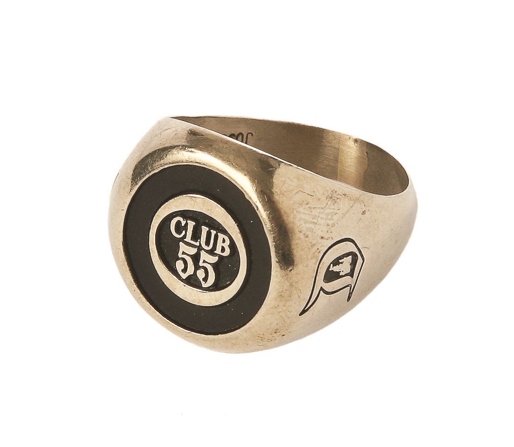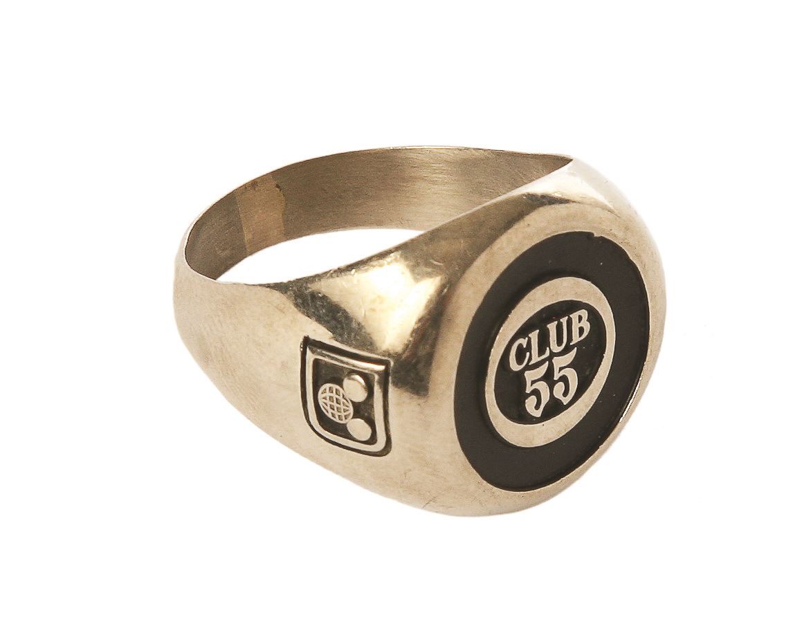 (Disneyland, 1975) An extremely rare Club 55 Cast -Member Service Ring, awarded to employees who started at Disneyland in 1955 and were still employed in 1975. Crafted in 10k white gold, this ring features the "Club 55" insignia on its face with the Disneyland "D" and EPCOT logos on the sides. Ring measures 1"x0.8" and is in very good condition. The ring is engraved on the interior of the band: Hank Dains, 7-17-75.